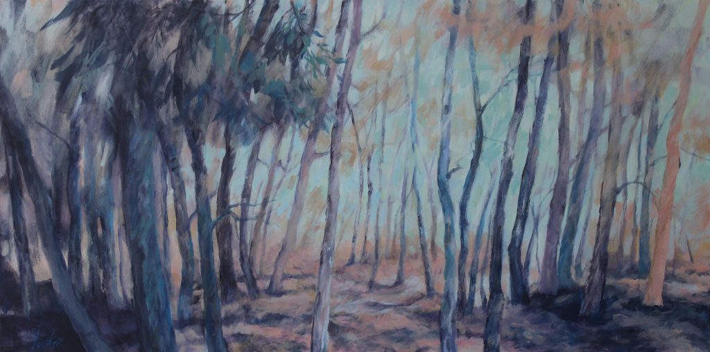 The dryness of the time of year is a key to the colour choice just as much as the time of day. Strong colour contrasts show light and shadow to create forms. One pathway can provide so many different views. Looking up, looking down, looking at ground level to the horizon and up through the canopy to the sky. All these different vantage points provide another way of seeing.