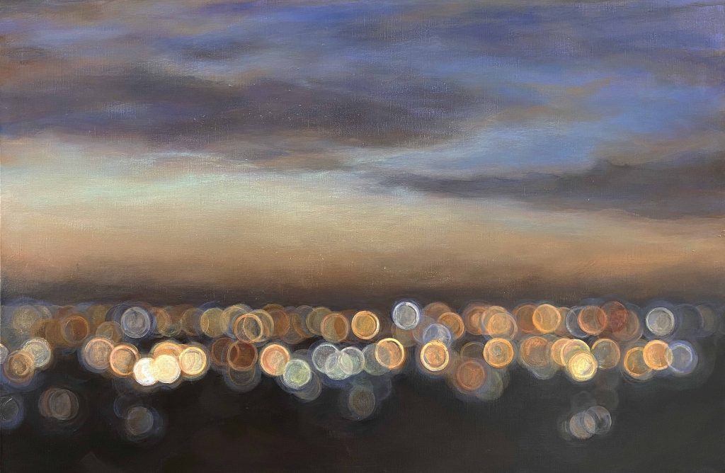 “During this period, I was also developing the ‘Bokeh series’ (pronounced “bokay”) Japanese term for “to blur”. I have been fascinated for decades with the images achieved from camera lens refraction and out of focus depth of field orbs. In my early work, you might see reference to this with a blurred out of focus backgrounds, while the current works now encompass the full view. These works are based on images that I have taken in the late afternoon, twilight and/or night-time traffic. The lights are being diffused into orbs of sparkling colour,” Felicia said. “Sunlight series has been a constant companion for me. I have revisited it numerous times over the past two decades, careful not to become too formulaic or staid, challenging myself to reinvent these beautiful views of a fleeting moment in time. I have wanted to engage the viewer by way of colour, the passage of light and even invoke the possibility of the eucalypt and earth smell.”