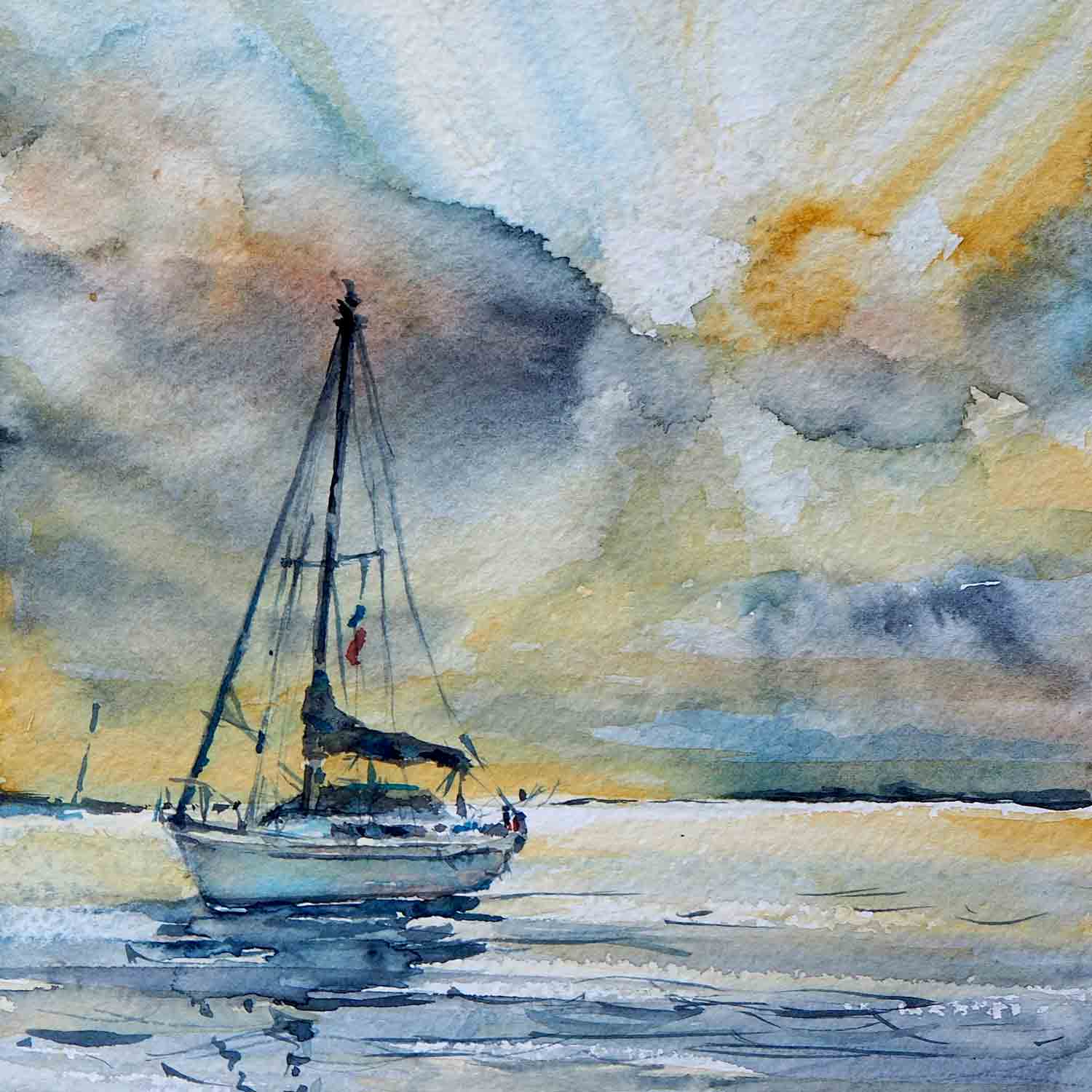 Sailing, Seascape, Boat, Sunrise, Watercolour, Australia, Clouds, Marine, Ocean