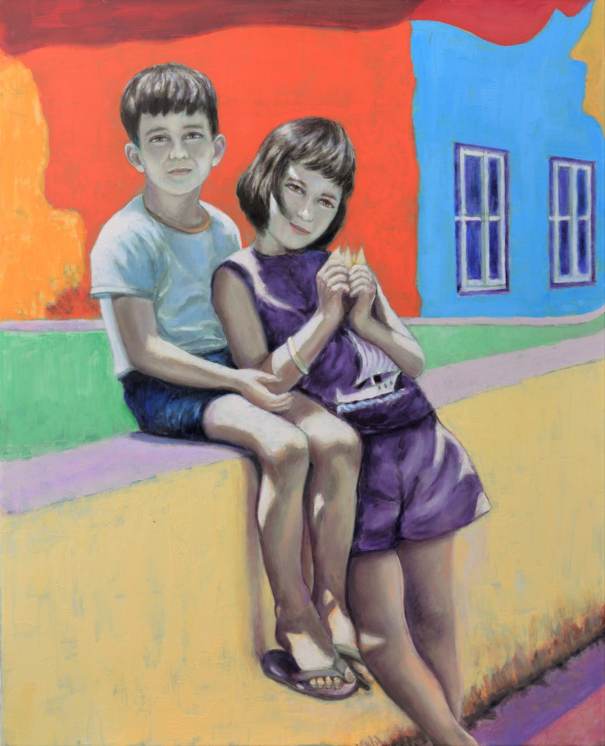 I used an old black and white photo and experimented with abstract shapes and vivid colours to capture the essence of childhood innocence. A brush and palate knife were used to apply the paint, giving the work a textured appearance.