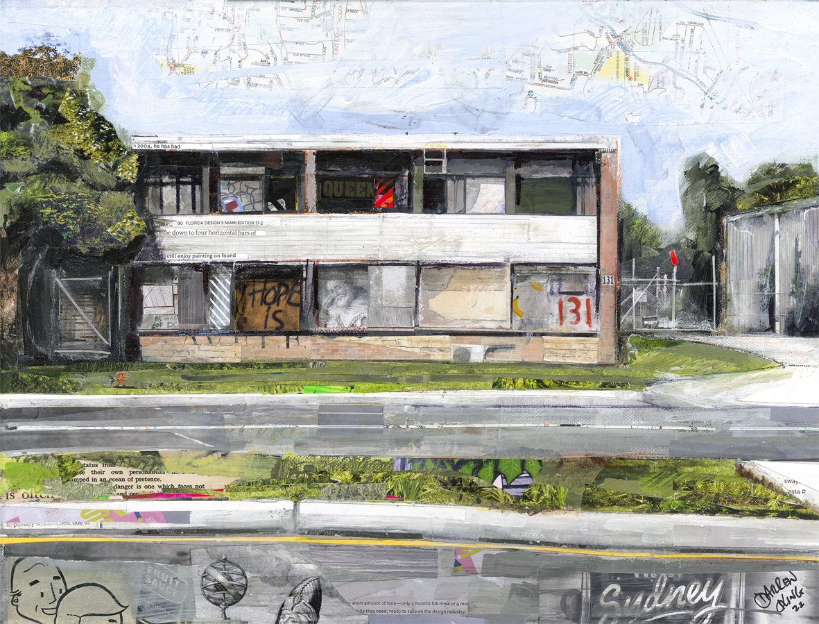 This artwork features paint, cut and torn magazines, maps, brochures, recycled then assembled to create this piece. A map of the local area is partially visible in the sky. The layered collaged elements create a nice textural surface.