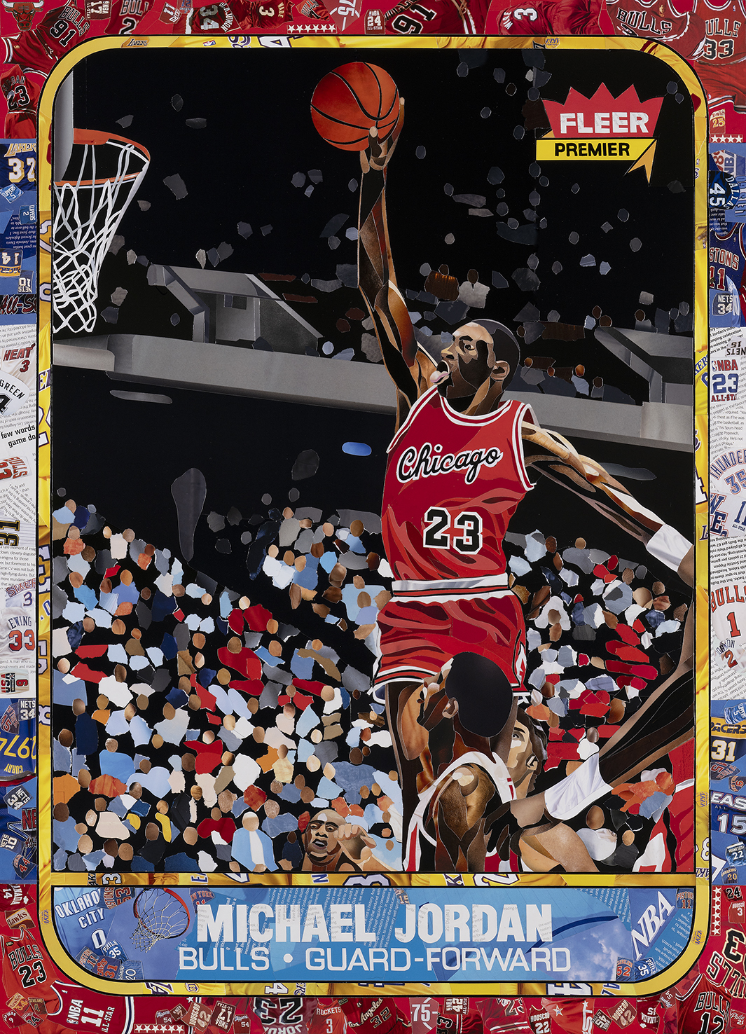 The legendary 1986 Fleer Michael Jordan Rookie Card — reimagined through collage. Using only authentic basketball cards and magazines, I hand-cut and assembled over 1,000 fragments to recreate this iconic image. No paint. No digital printing.