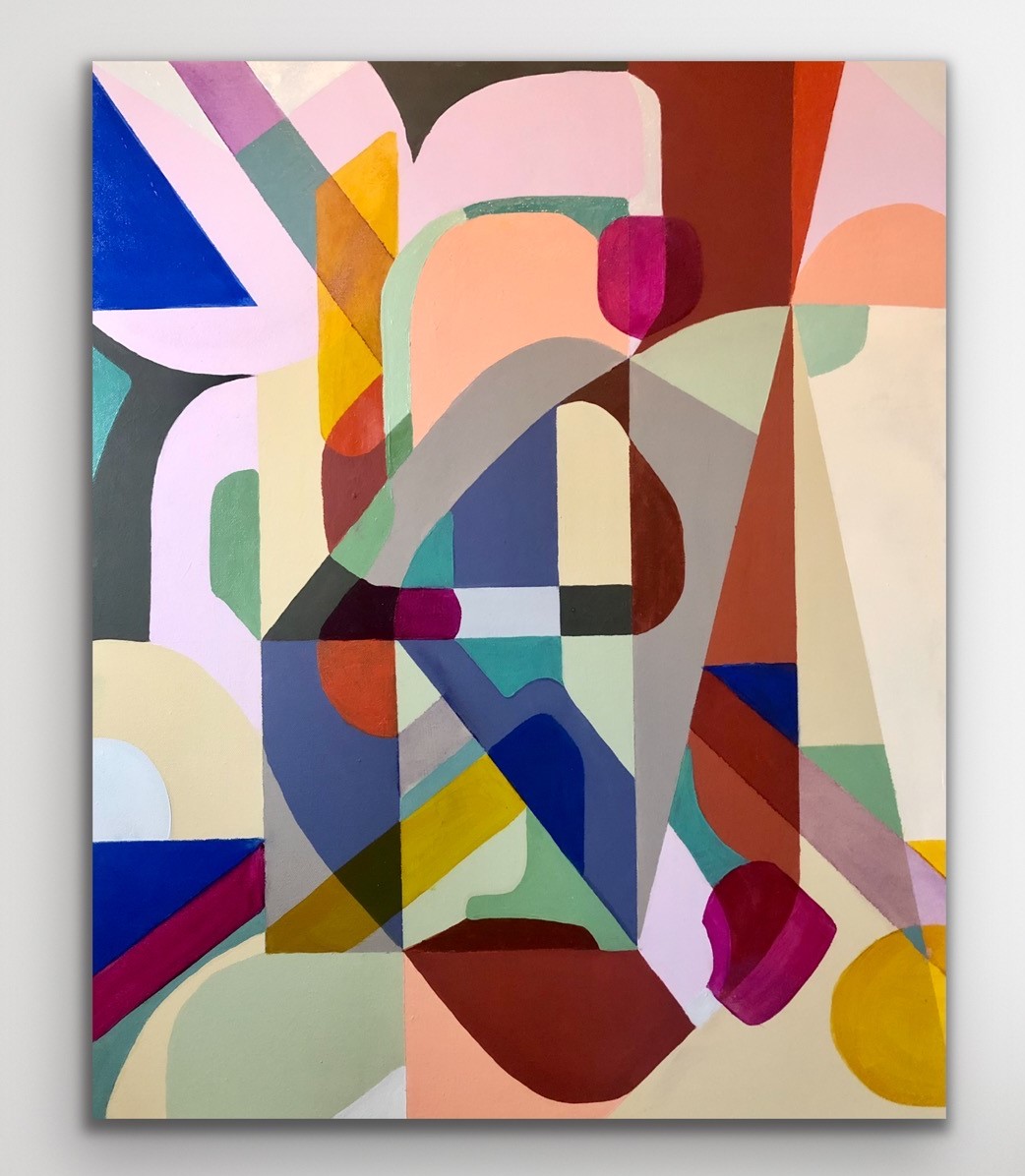 Elizabeth’s paintings play with the juxtaposition between spontaneity and calculation. Where traditional abstraction uses gesture to represent impulse, Elizabeth uses form and structure traditionally considered premediated, in an unplanned and spontaneous manner to create inorganic forms.