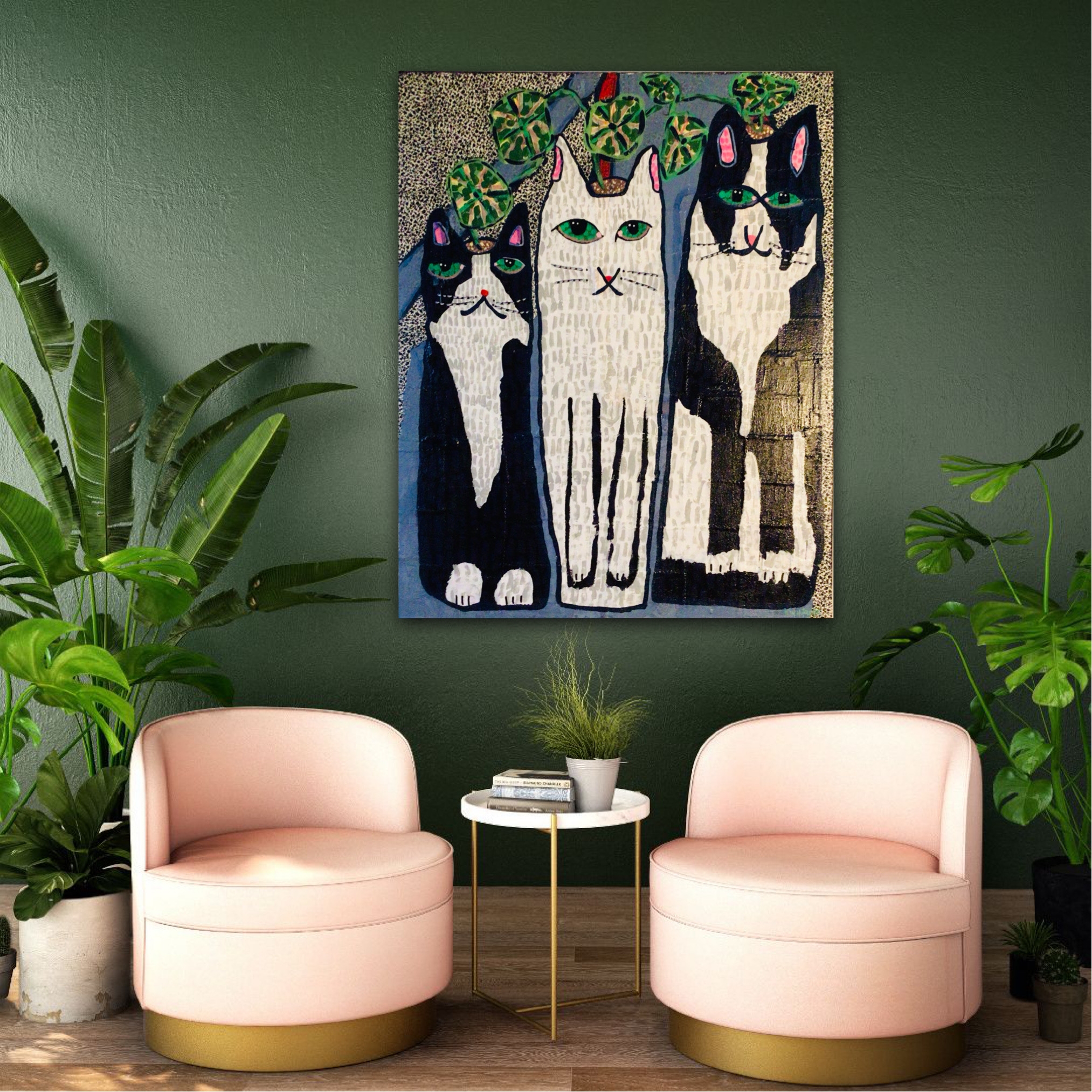 “3 Wise Cats” is an original mixed media collage painting by Australian artist Kim Magee. This medium-sized artwork (75cm x 60cm x 2cm) features a trio of black and white cats with intricate details and colorful accents. Signed by the artist and ready to hang, this Naïve Style folk art-inspired piece is perfect for cat lovers and art enthusiasts alike. The canvas painting comes with a certificate of authenticity issued by the artist and is a one-of-a-kind piece. Add a touch of whimsy to your home décor with this unique and playful artwork.