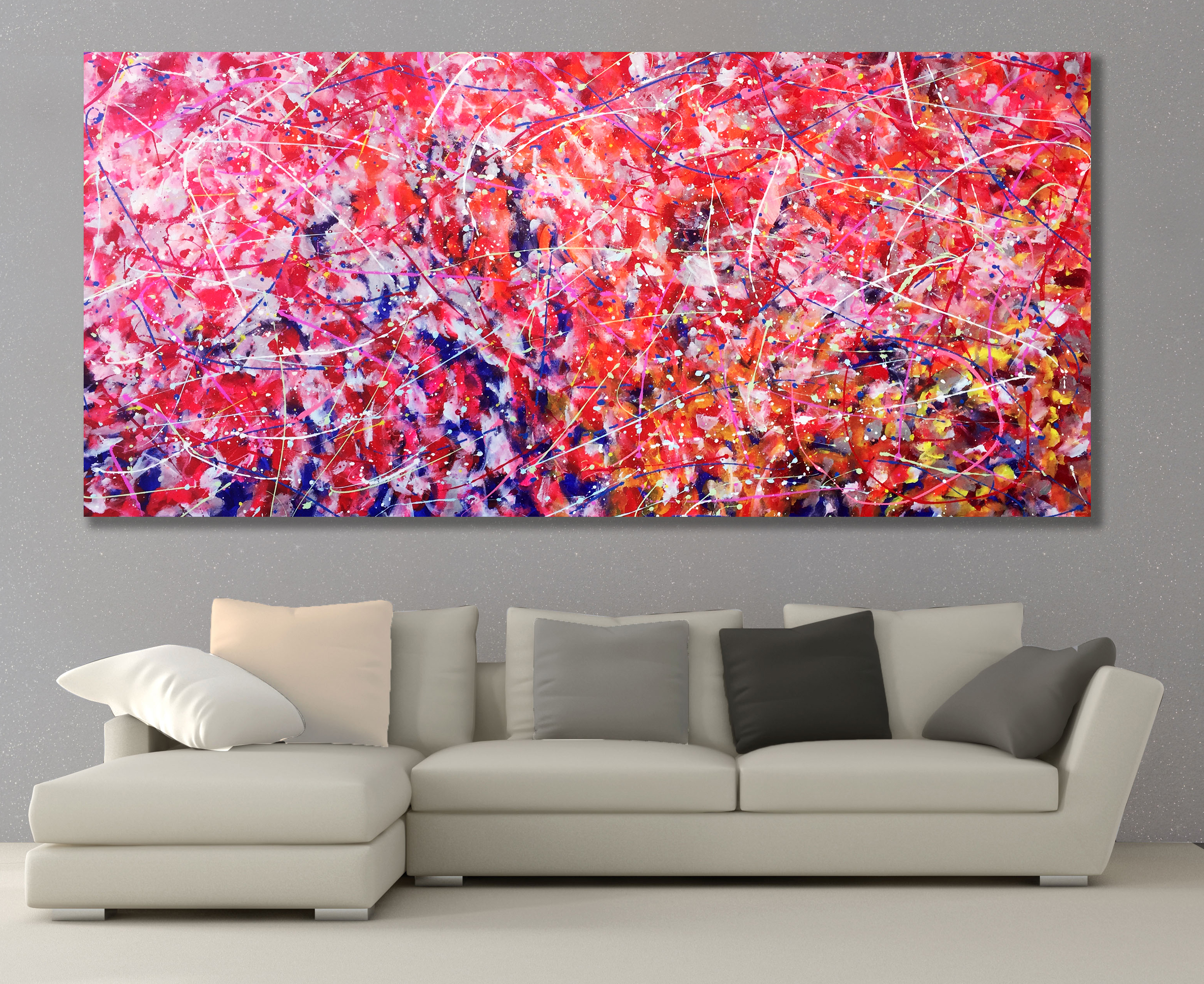 This artwork reflects on the emotions I had as a child painting, without any intention to create form or structure. The work is about feeling childlike with art, just for a short while, without any assumptions. It is an exploration of abstractionism. This work is painted on 12 oz gallery canvas and has been sealed with varnish. The canvas is hand-stretched onto a frame is 195 cm in width by 90 cm in height.