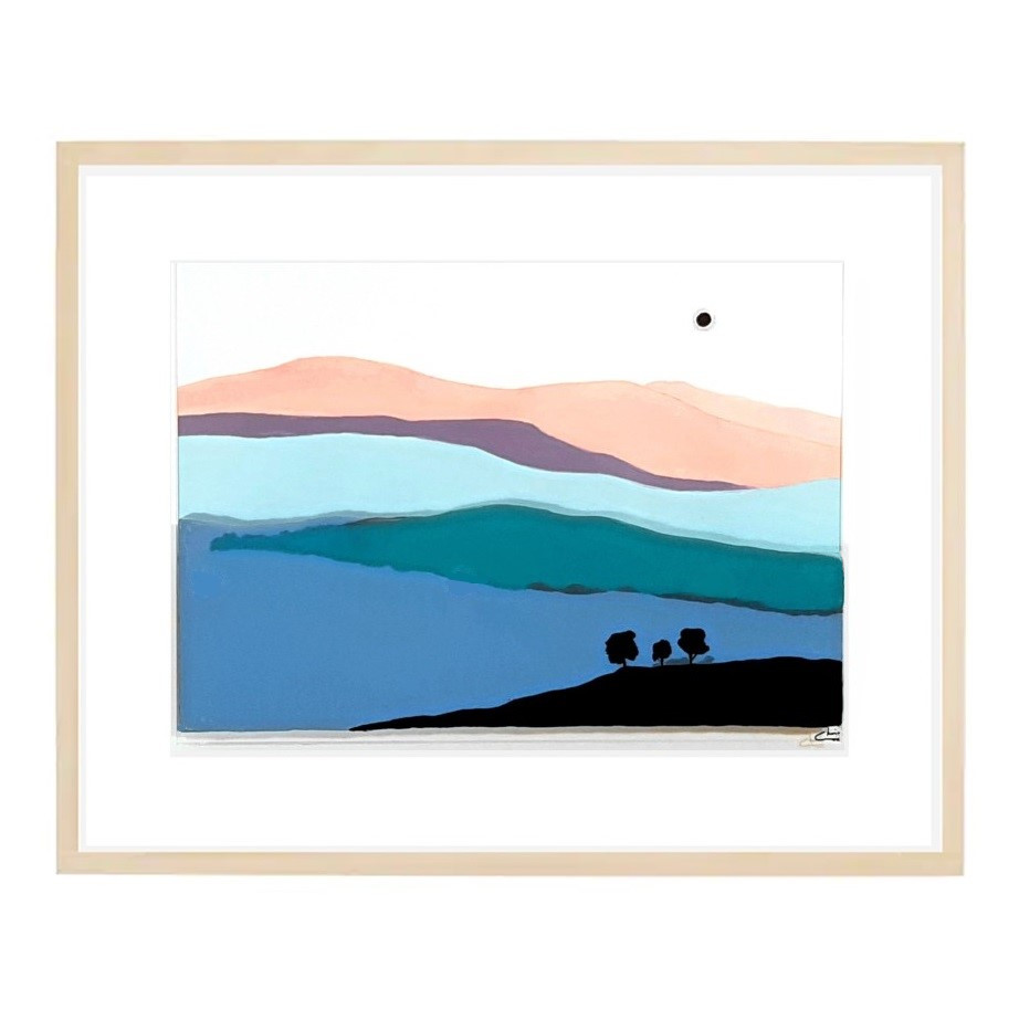 Inspired by the Australian Great Dividing Range, this original Acrylic captures the amazing colour transition of the mountain range from dusk till dawn. Colour is applied onto a perspex / acrylic sheet on the inside of the sheet to protect the artwork, while the background and 3d effect is created by a matt border and sheet of 300gsm paper with an Acrylic mountain backdrop. This is all presented in a box frame creating a 3D visual effect that is quite striking making this a real show piece in any interior design application. Signed on Front as well as aCertificate of Authenticity provided.