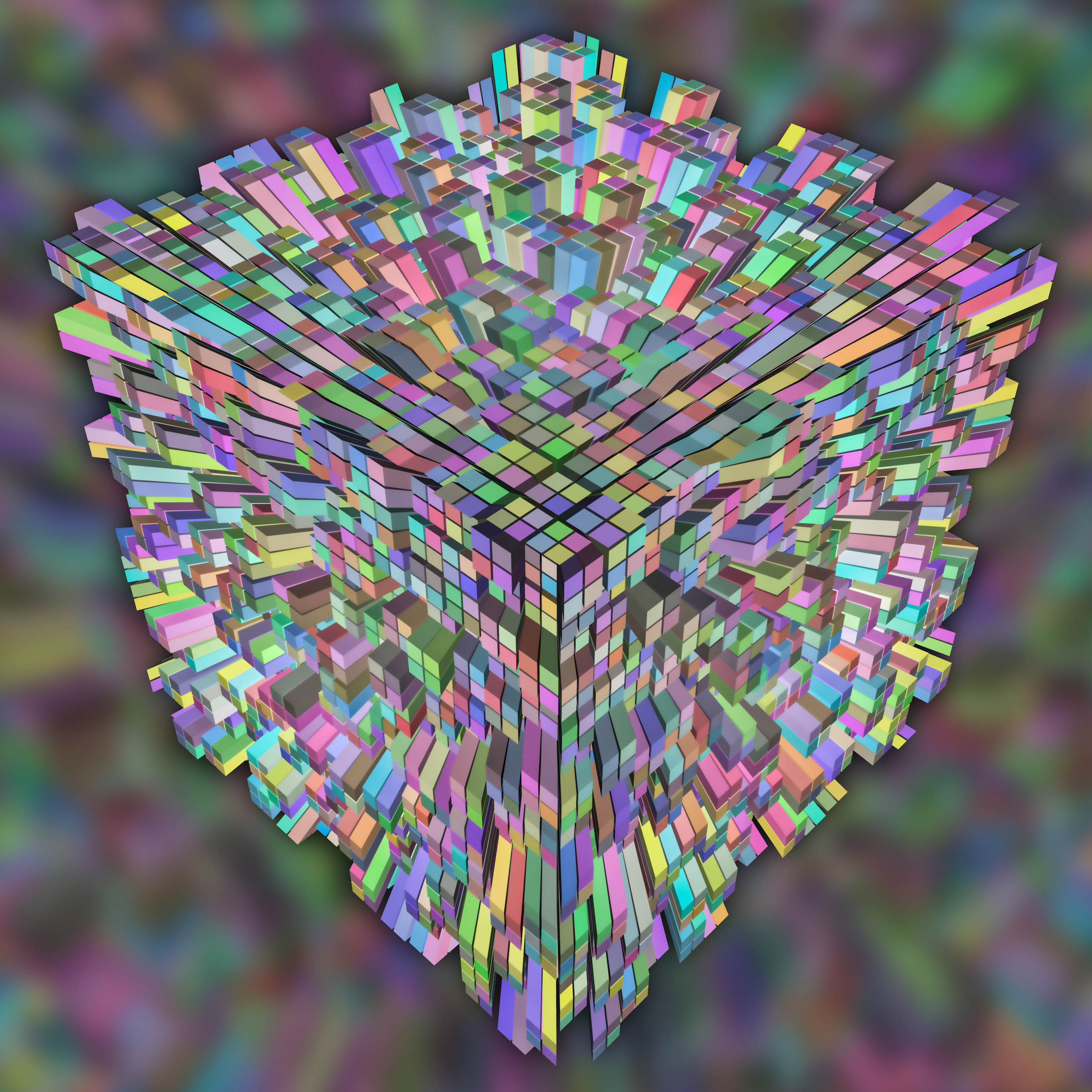 ‘3D SpaceCube No 1 – Pastel’ by PLAYlogo. Created using Wolfram Mathematica and custom algorithms, this is 3D Maths Art of the very highest quality for genuine tech fans. And at super high 8192×8192 resolution, this image prints well even at the largest sizes. Some background from the artist: