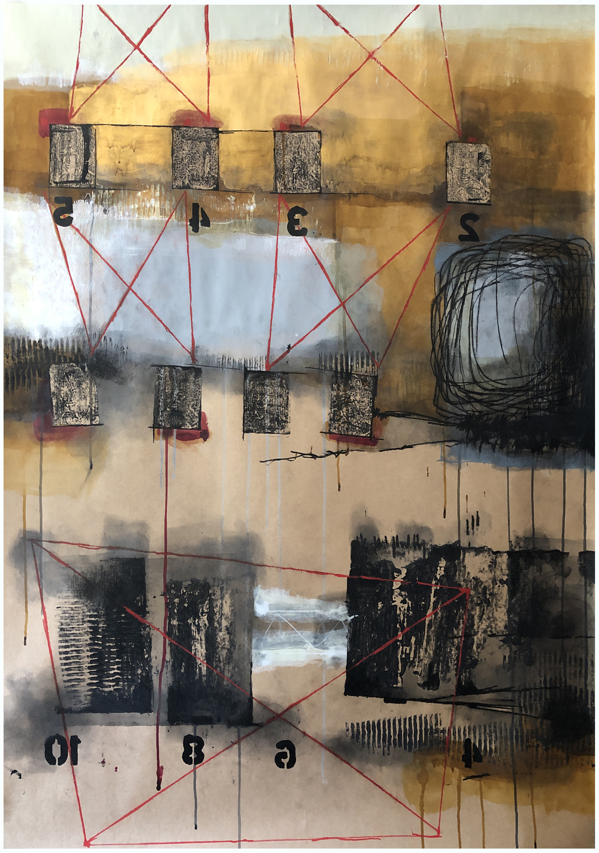 6 8 10 to Four – Mixed Media on brown paper adhered to wood, ready to hang.