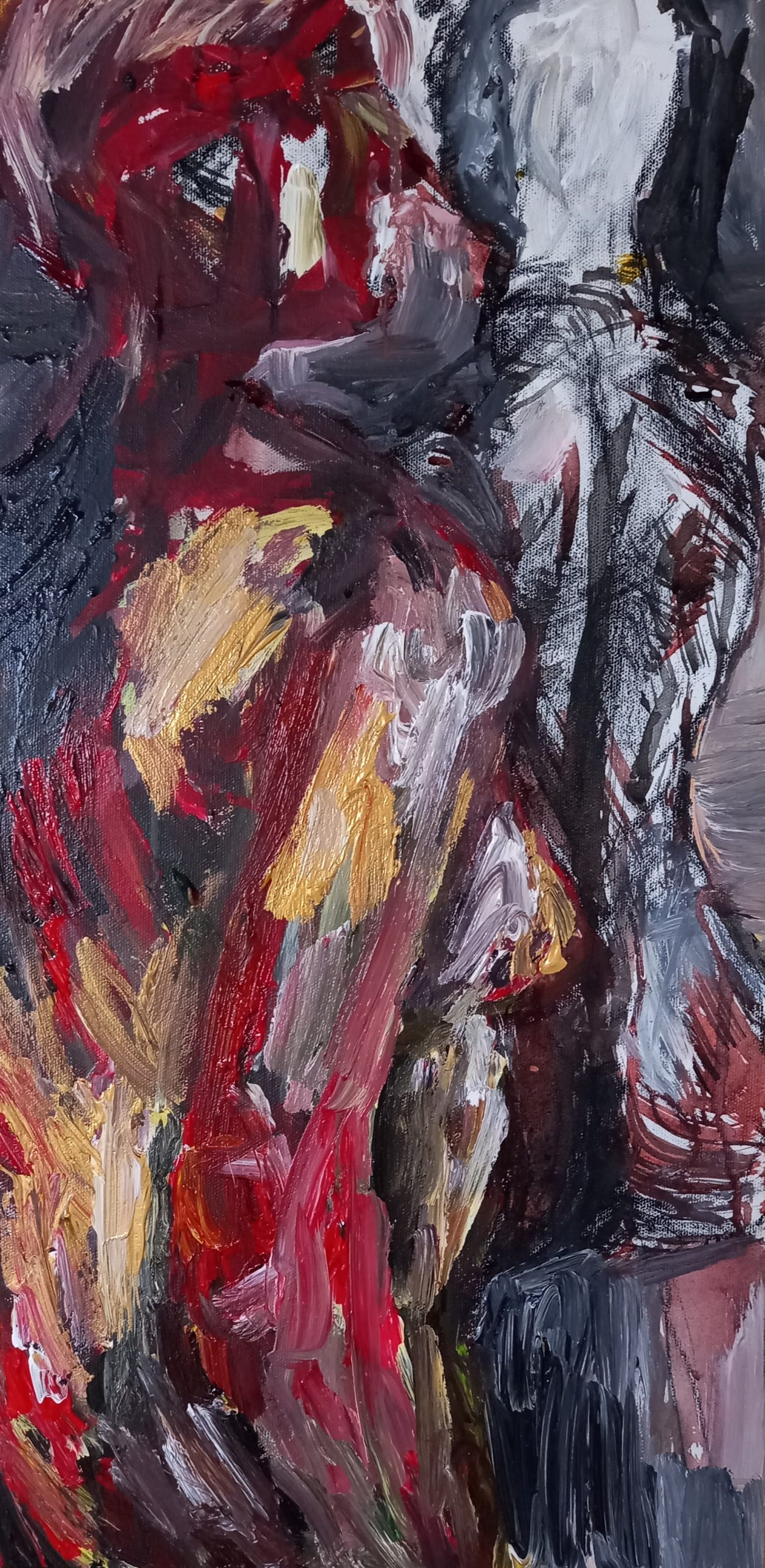 Using a combination of largely reds, blacks and gold I wanted this figurative abstracted piece to have a striking, earthy and expressionist feeling to it. I like the mysterious enigmatic world that this piece portrays.