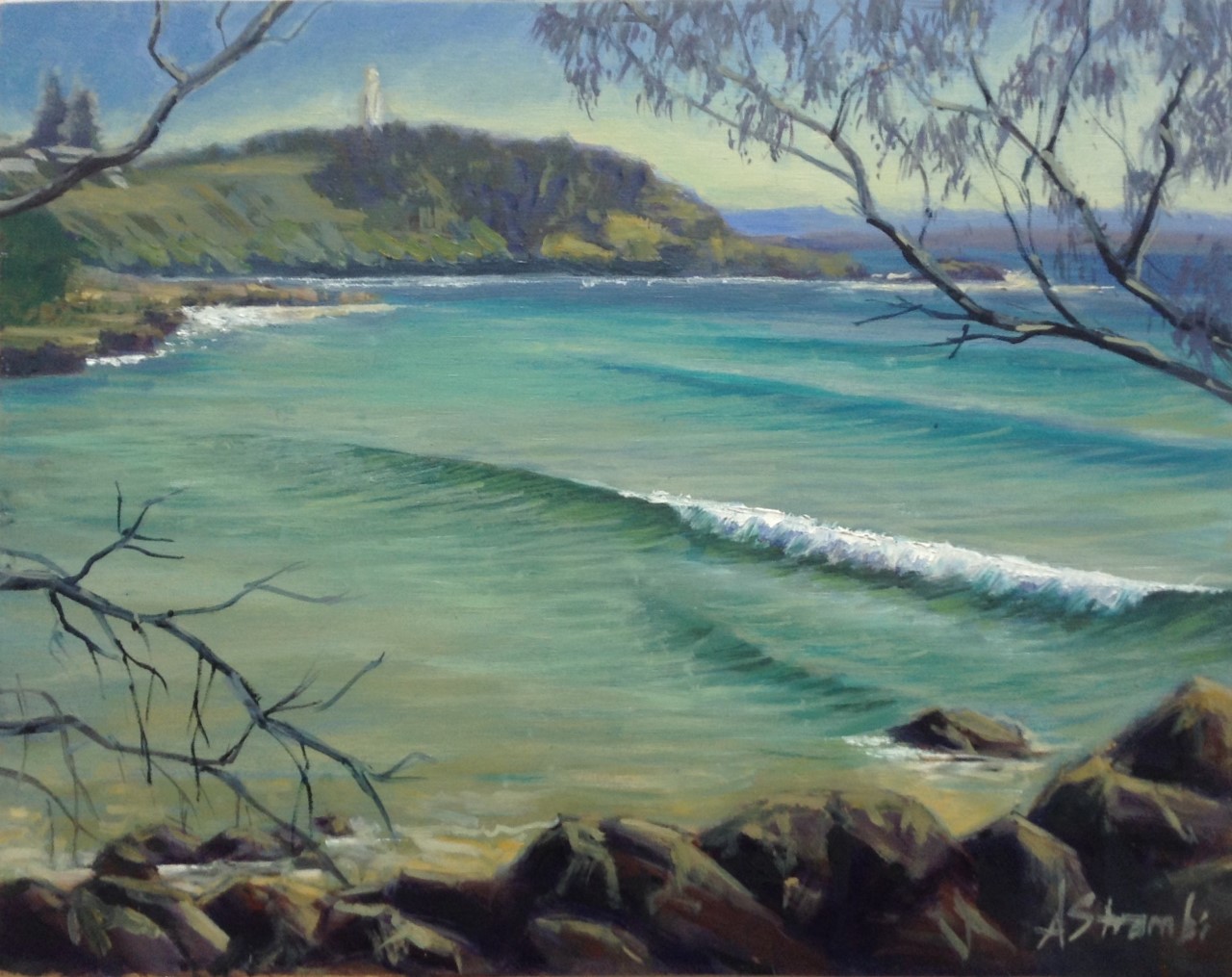 The painting was inspired by the view from Convent Beach towards the Yamba headland with the lighthouse visible in the distance.