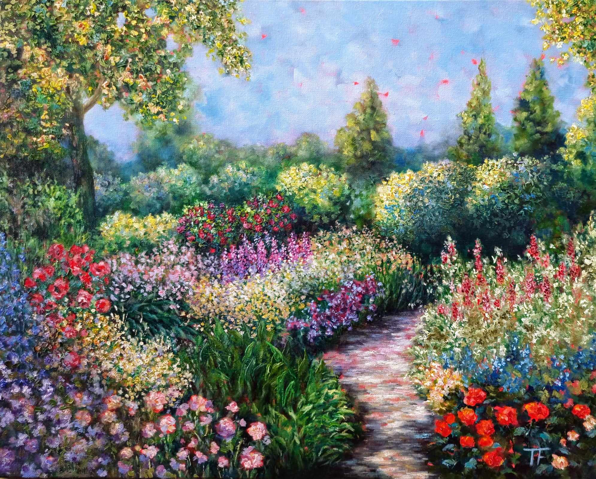 This is my impression of an English cottage garden. I returned recently from London, where I was constantly stopped by an abundance of beautiful flowers. This particular painting was inspired by a stunning garden in Hyde Park (near Hyde Park Corner). It’s done in oil paint in an impressionist style. I guess, it was influenced by “After Impressionism” exhibition I just visited in National Gallery.