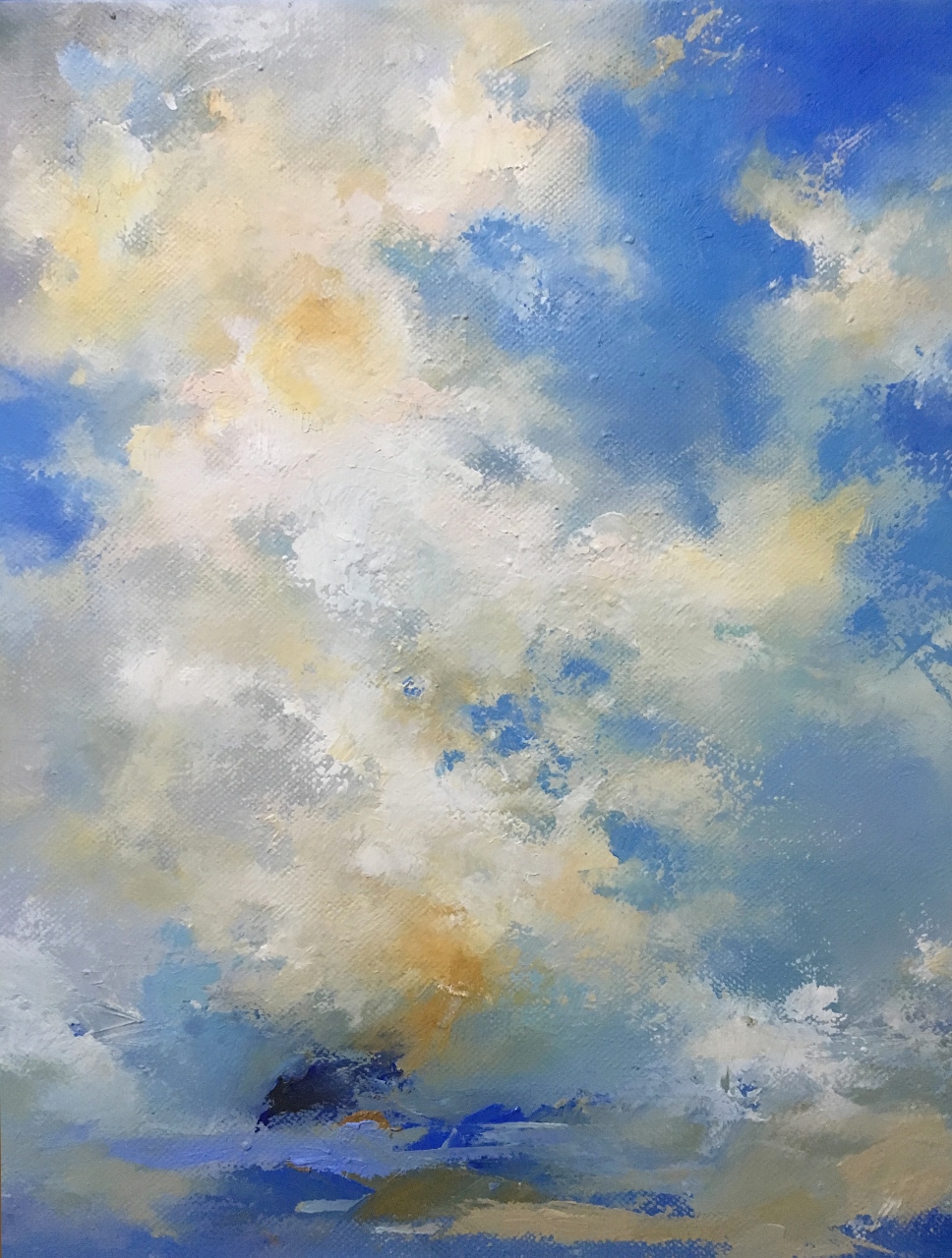 A Dance of Water and Light – This painting practically moves with the way the clouds have been depicted. The secret is many layers of high pigment oil paint, with a combination of texture and glazing. I wanted to bring the big sky into the home, even with a smaller sized painting. As usual, there’s water also, which I’m connected to and which I always find myself including in some way.