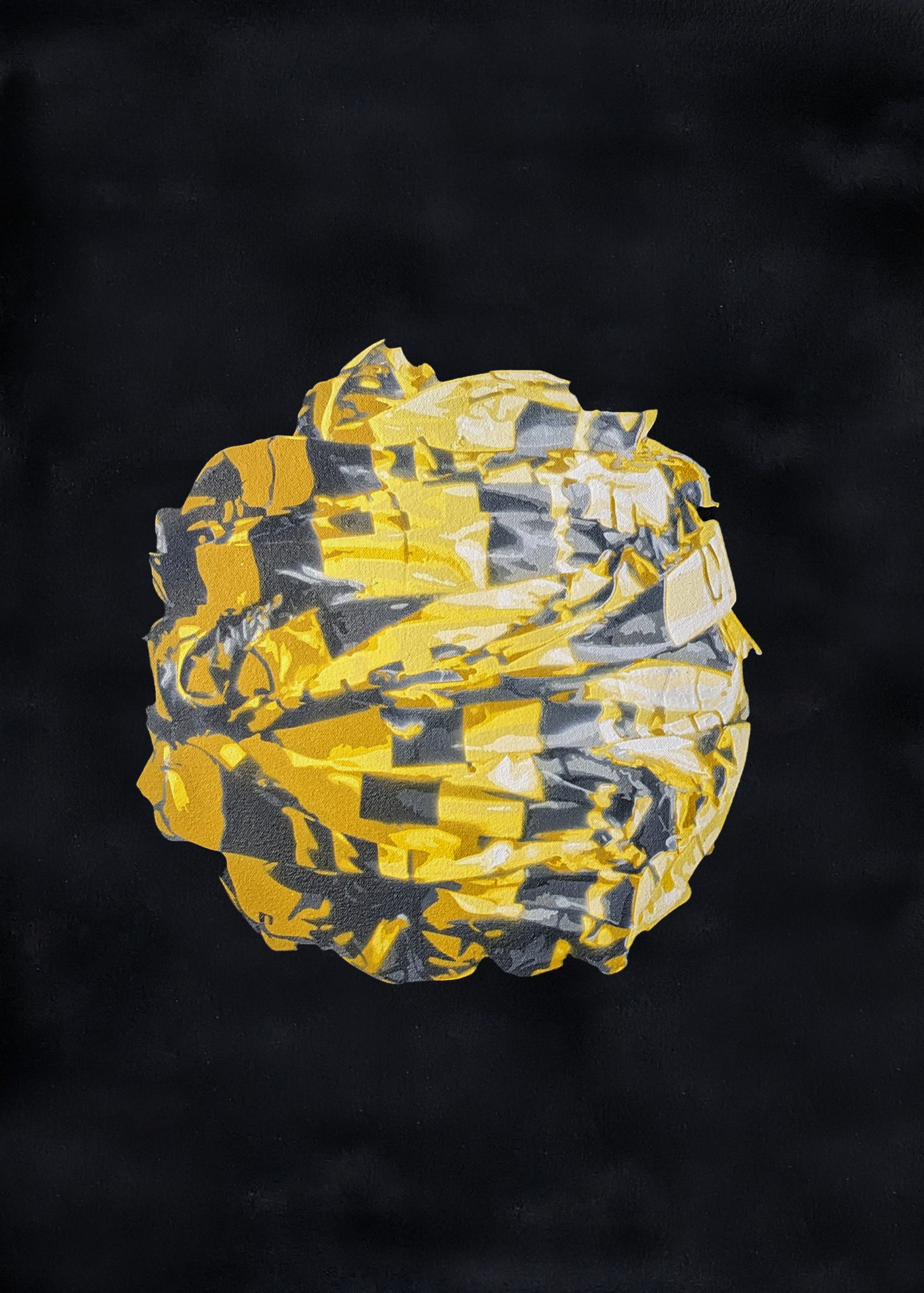 Crafted using a multi-layered stencil process and high-quality MTN94 spray paint, this piece delivers exceptional detail and depth, pushing the boundaries of stencil-based art. What appears to be a chaotic ball of plastic is, in fact, a meticulously planned optical illusion — razor-sharp, crisp layers that trick the eye and elevate the senses.
