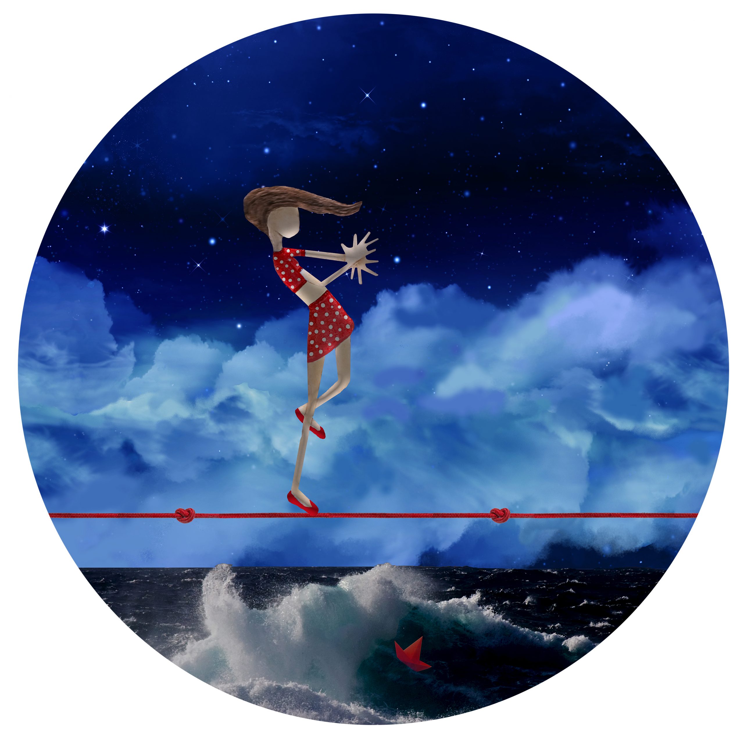 A Day in October (2021) marks the beginning of an inner disturbance that was triggered by a series of interactions with an acquaintance. The work symbolises the initial desire to develop this connection however, it created a catalyst by uncovering areas in my life that required addressing. The paper boat signifies the uncomfortable stirring on an emotional level, the figure on the tight rope embodies the difficulty in balancing a new awareness.