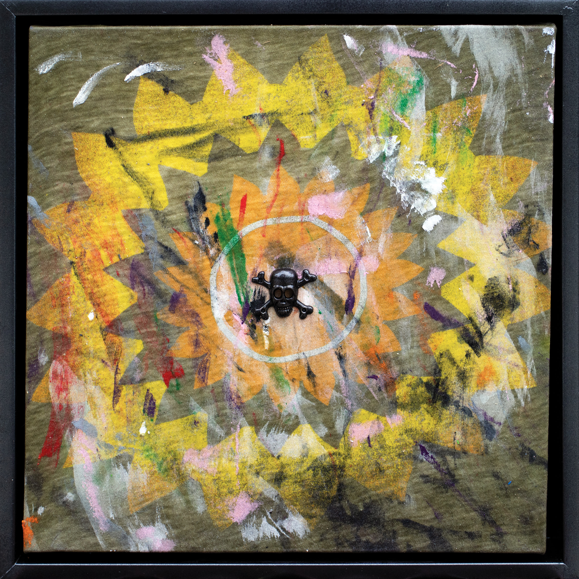 Mixed media – Acrylic, spray paint, and oil stick on t-shirt worn while painting, sealed over birch board
