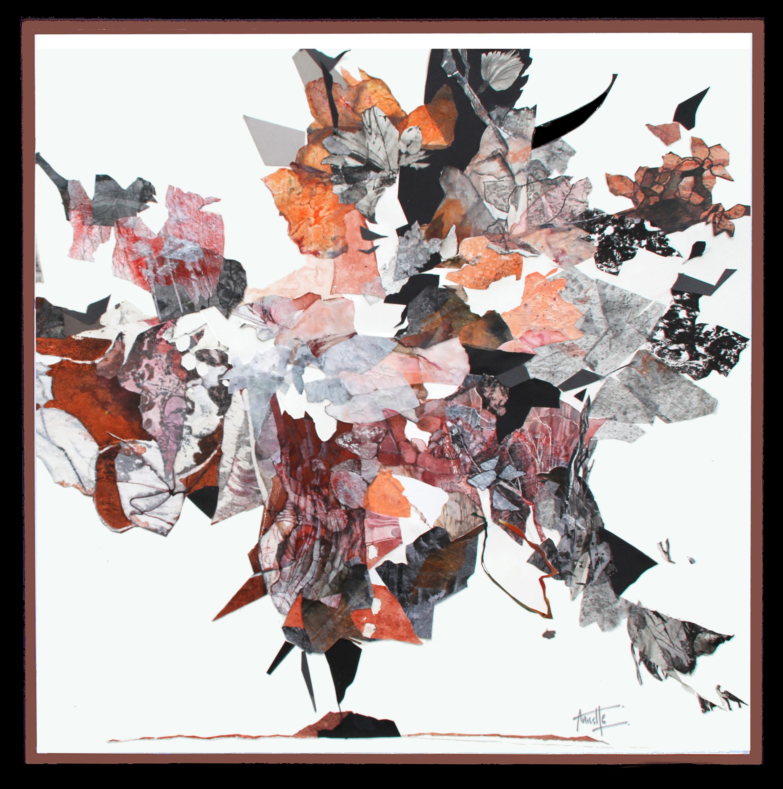 I describe this as one of my painted, collaged, explosive arrangements, where I use a an amalgam of techniques and mediums including intricate pencil drawings, mono-printed textures and painted pieces in a process of deconstruction and reconstruction. The connecting and disconnecting passages emulate the delicate balance vital to our existence with nature.