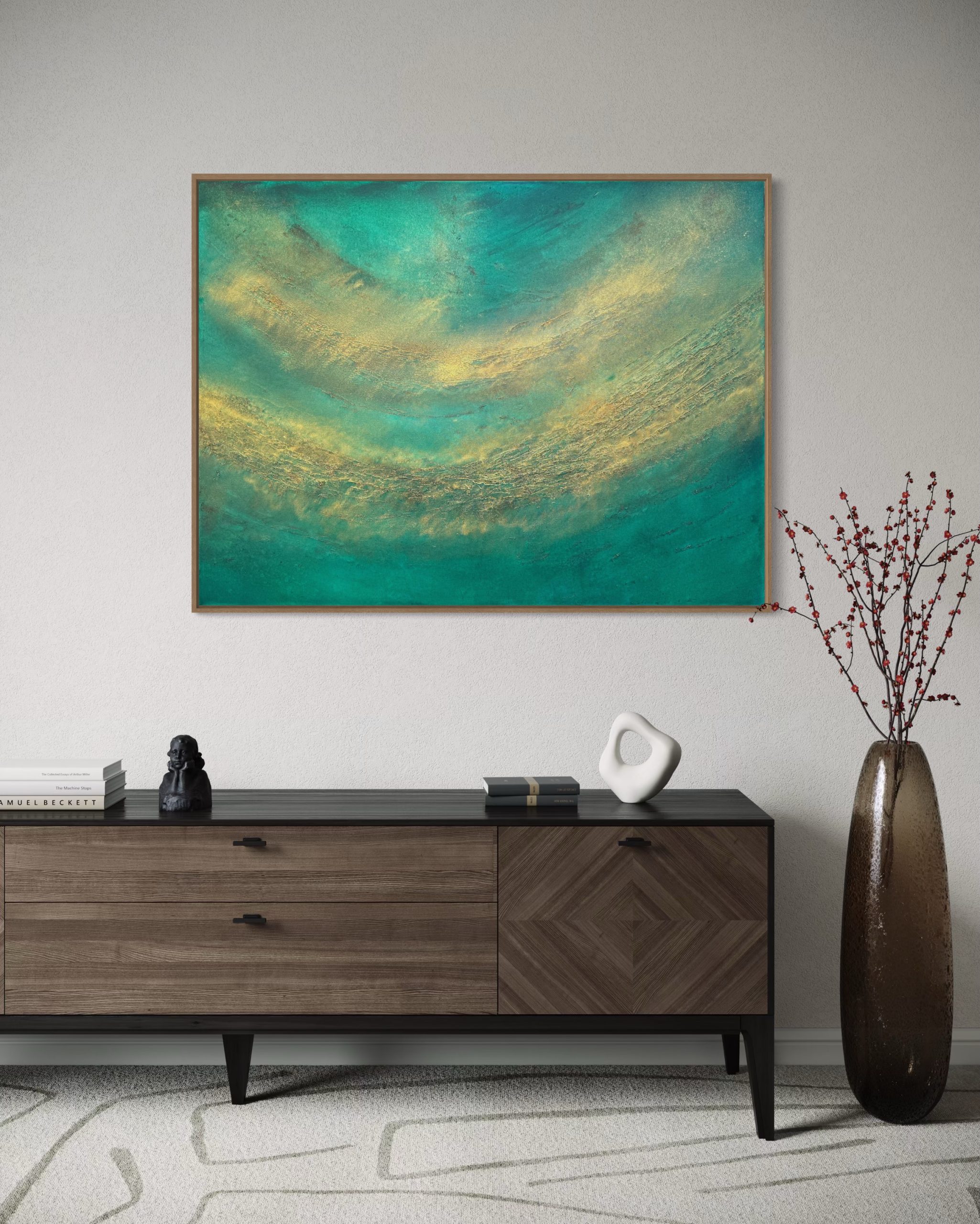 A Distant Time by Nadine Hobson – Sweeping sections of texture in shades of deep green, this abstract artwork is dynamic and eye catching. The gold highlights draw the eye across the canvas, providing a sense of space and movement. It could be a supernova in space, or a view from the deep sea looking to the surface of the water. What do you see? A true statement piece, this artwork will bring a feeling of magic and mystery to any space. Framed in a native mahogany float frame, with signature and title on the back.