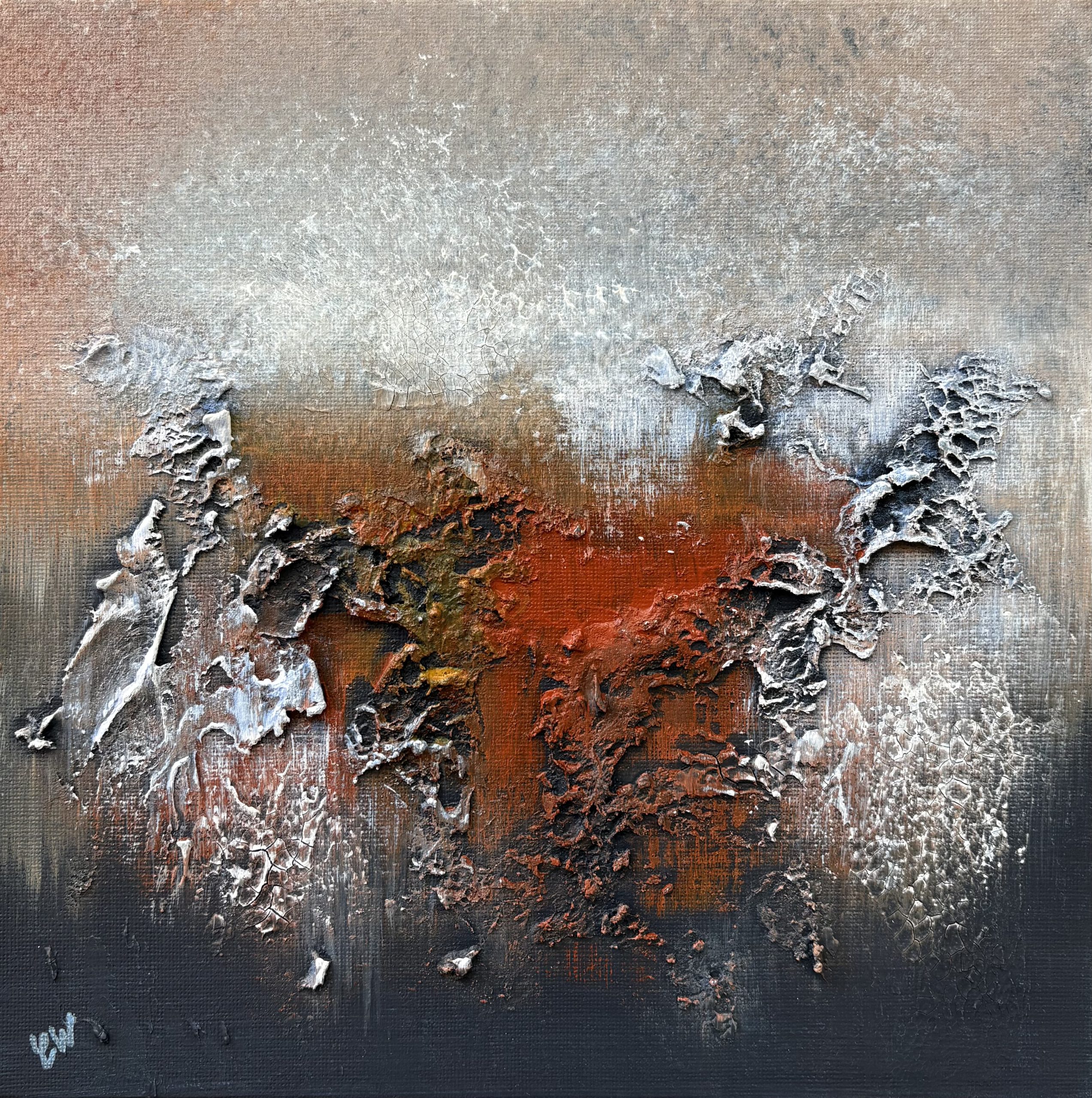 A Dreamscape by Carrie Welsh is an abstract landscape piece with beautiful texture. Â 25 x 25 cm. Acrylic on canvas, ready to hang. Frame not included.