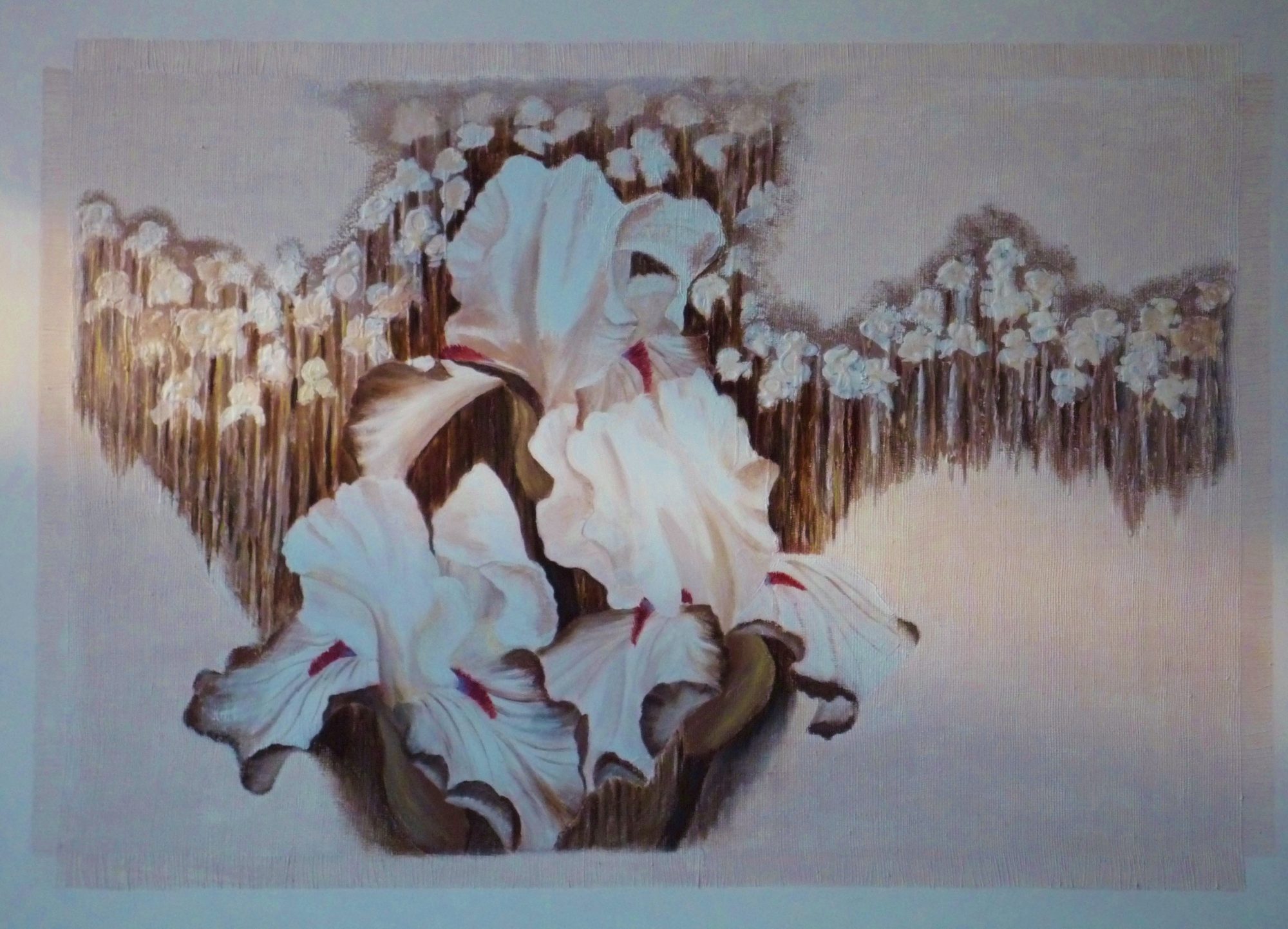 This original highly textured and very contemporary floral painting was inspired by the large plantings of irises around our ponds. They grow in large clumps and when flowering are an amazing sight. They look very natural growing around the ponds and my aim was to convey their wild habitat with texture, eathy colours and some abstraction. The painting is large and in colours which would sit naturally in any setting and would not clash with any colour in its proximity. The painting is done on a large sheet of thin hessian-like mesh attached to the canvas which gives the texture. It is on a very thick stretched canvas which strong stretcher bars.