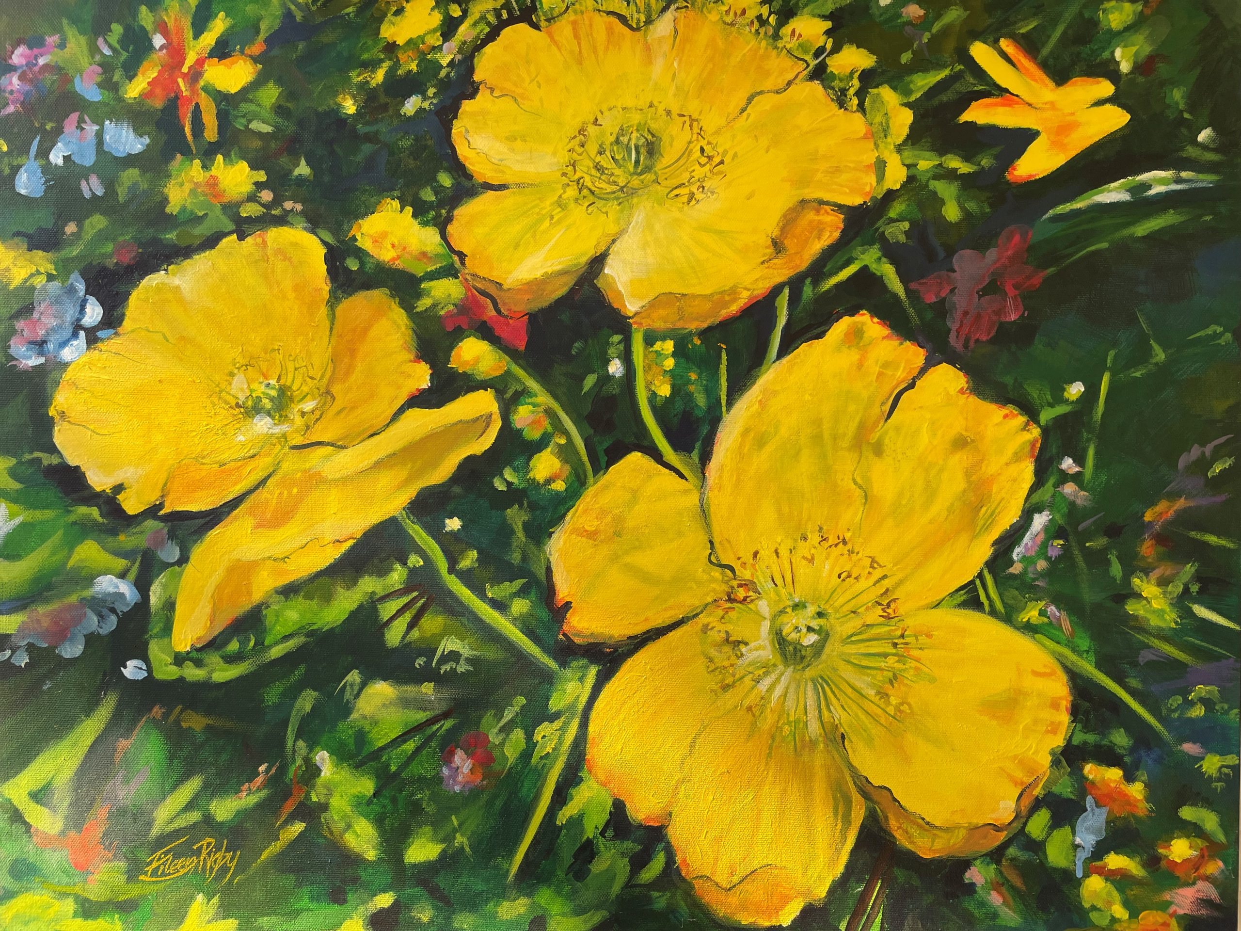 A Field of Yellow Poppies by Eileen Rigby – Poppies from France were the inspiration for this painting. I am inspired by nature and the world around me and my paintings are a reflection of where I have been and what I have seen, with every painting being connected to a memory. Original acrylic painting on canvas using only professional paints.