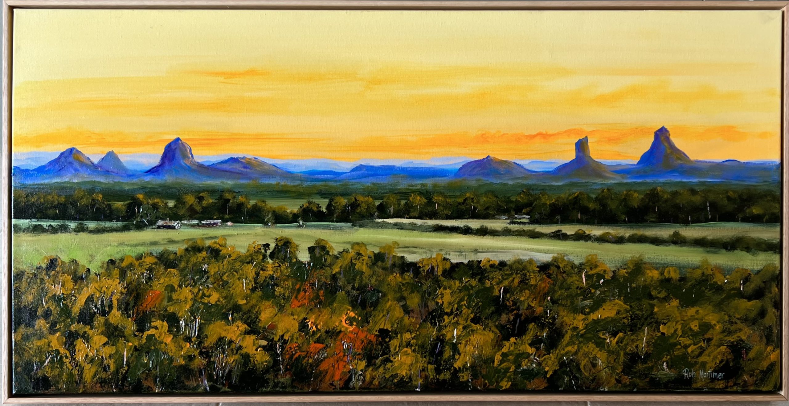 A Glasshouse sunset original by Robert Mortimer. The Glasshouse mountains from Pelican Waters. Hooks and felt pads.