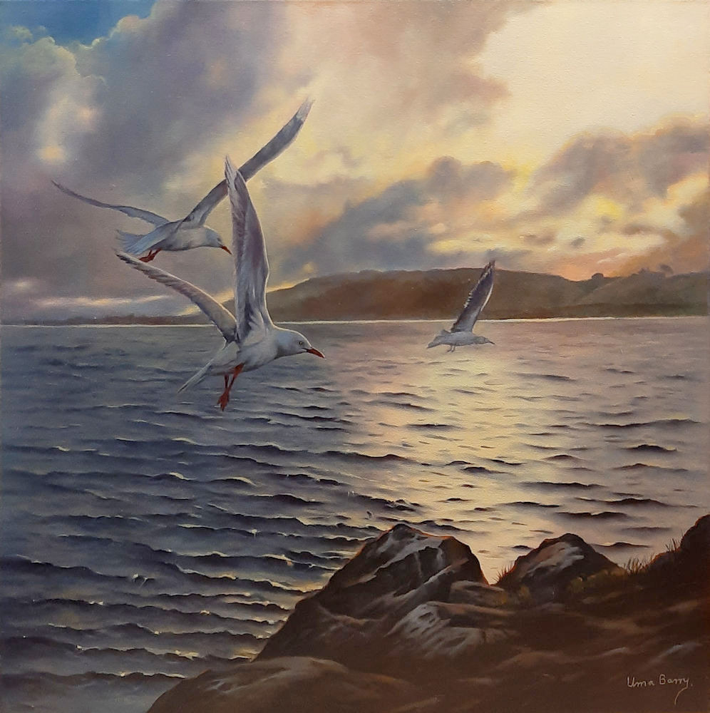 A happy flight home by Uma Barry – Hi everyone, here is a piece titled ‘A happy flight home’ which is a peaceful scene from Stanley, Tasmania. The reference material comes from our trip to this beautiful little town in 2019. This amazing sunset with some happy seagulls with all their chirping and excitement heading home after a long day. I hope you enjoy it as much I loved painting it. It comes all ready for your wall with a wire backing, sides matched to suit this piece and a certificate of authenticity. Thank you so much for viewing and supporting my artwork, it means a lot to me. ❤️❤️❤️