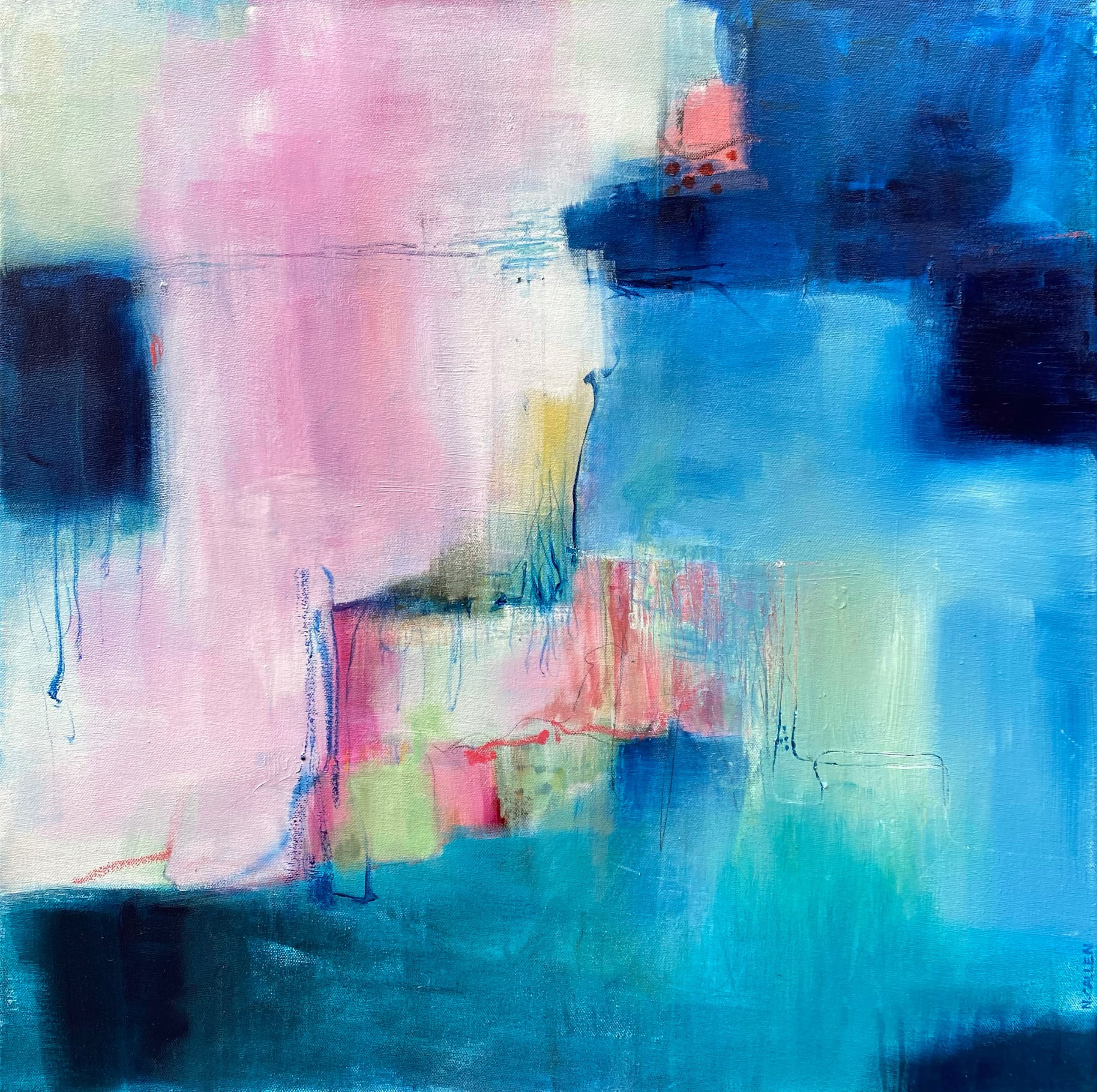 A Hidden Plot by Narelle Callen – Â is an abstract painting influenced by an aerial view of gardens or farms by the sea. Â You can see the garden sitting adjacent to the deep blues of the sea with the dusk pink of the land to the left. Â A Hidden Plot has a peaceful, calm feel to it.