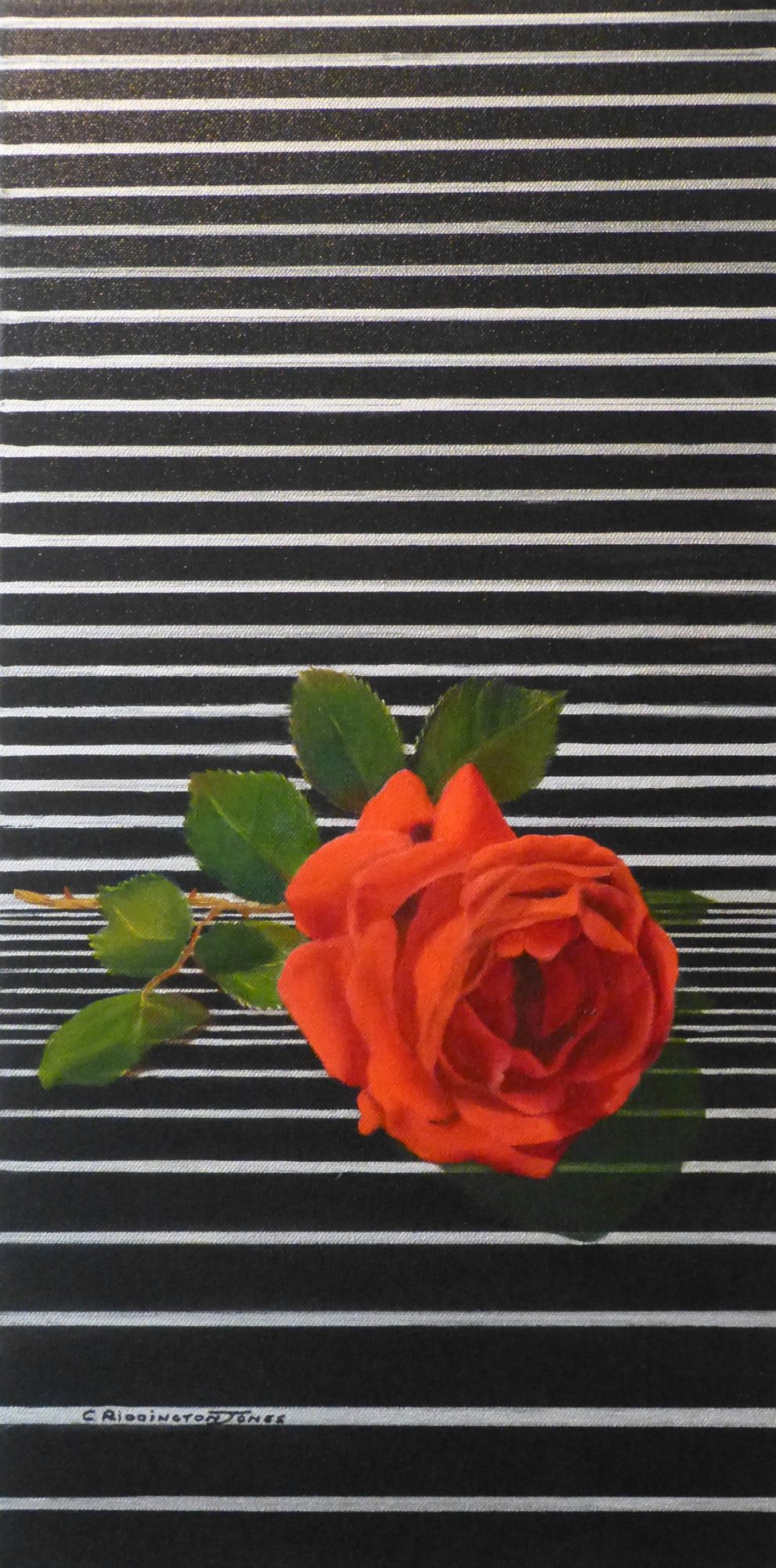 A Hint of Romance is a striking Black, Silver and Red Original painting. It would be a striking addition on a small wall either hanging or just placed on a table or bench. The stripes have been drawn on with a great deal of care with a Posca Pen which is both waterproof and fade resistant. The beautiful rose has been meticulously painted with oil paint. The painting has been finished with an Acid Free Archival Gloss Varnish.