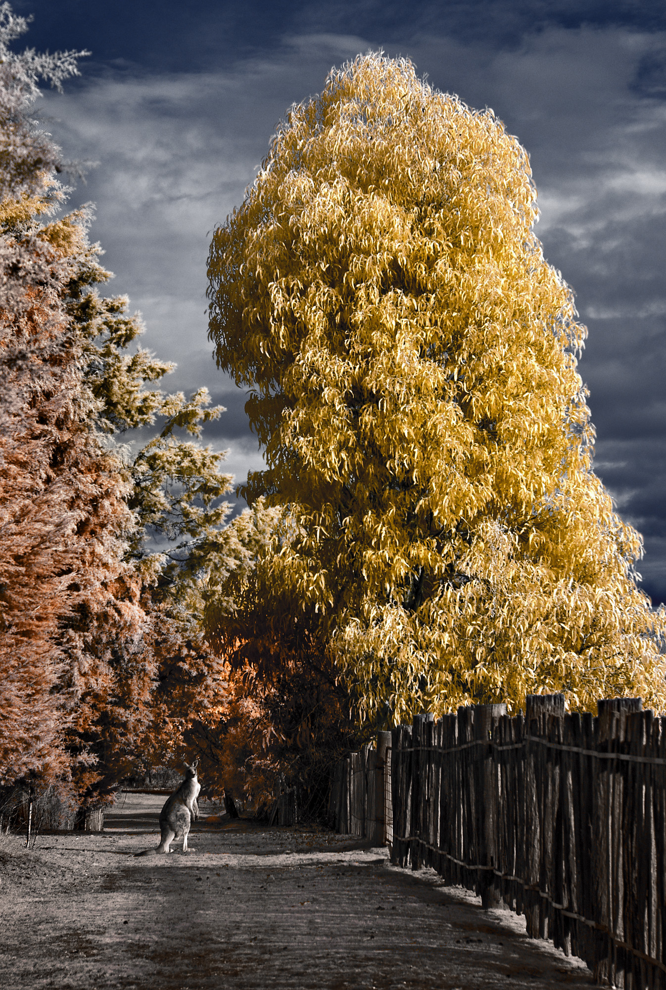 A lone kangaroo occupies a fenced laneway amongst the gums at Hill End in NSW.