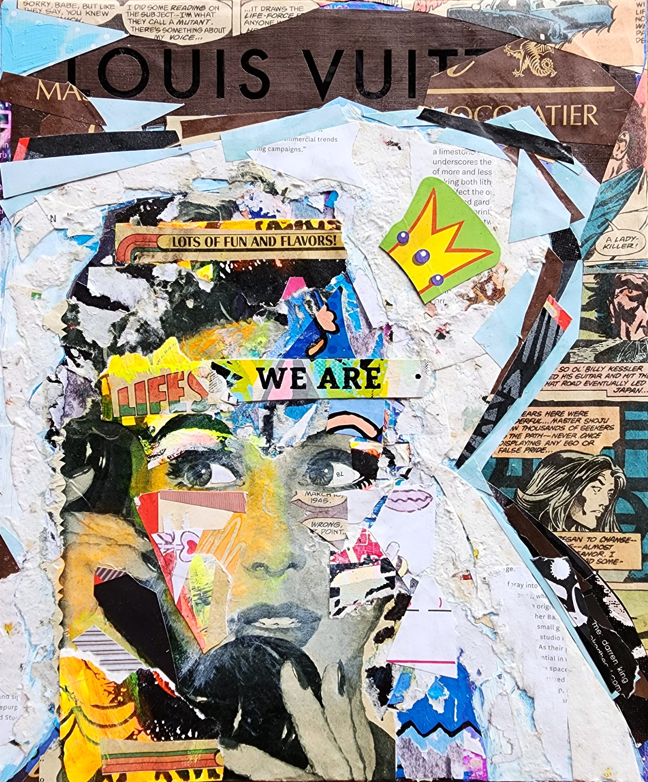 The collage features elements harvested from various old books, paper bags, brochures, magazines and junk mail. All bits are torn, cut, assembled and glued to create this textured one of a kind original artwork. This particular piece specifically features elements taken from vintage comic books, an old magazine called ‘English Woman’, a Louis Vuitton Paper bag and a Lindt Chocolate paper bag.