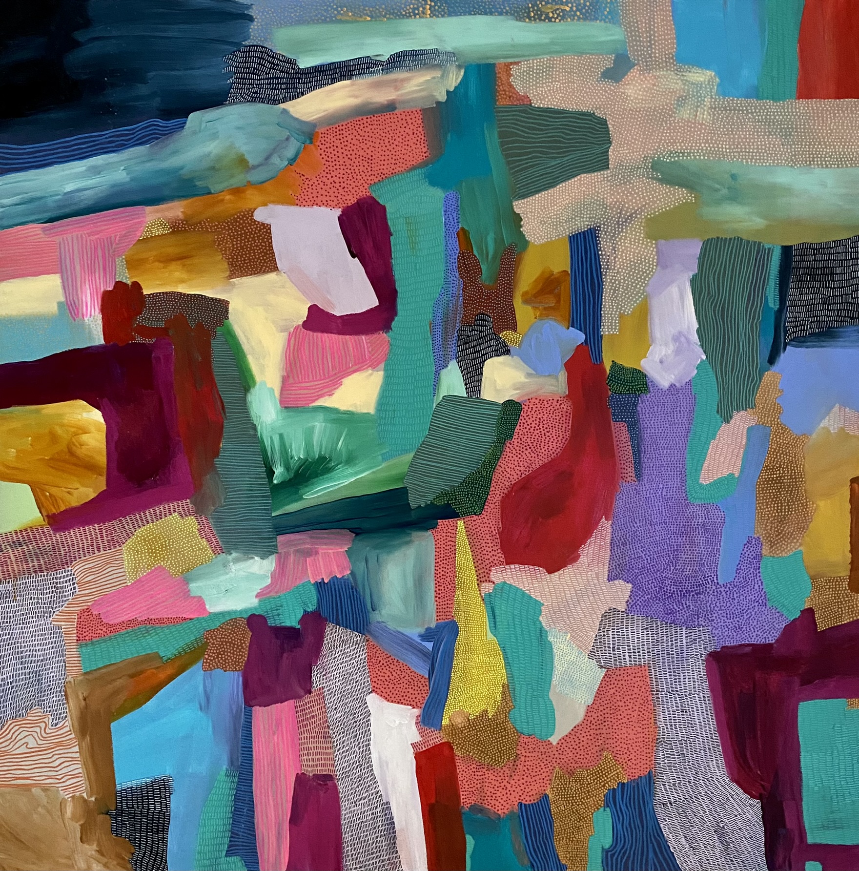 A little life by Laura Oczos – This is a large, square abstract painting was created late 2021 with colours inspired by the (then upcoming) 2022 Dulux Wonder palette. Whilst this artwork is not directly related to my current practice, it marked the first time I started to focus on creating abstract landscapes by consciously blurring details to reduce the landscape into forms and colour. This was also the first time I chose a specific colour palette, rather than working intuitively. The colours in this work are less bold than usual however there are still areas od pattern in both contrasting and complimentary colours.