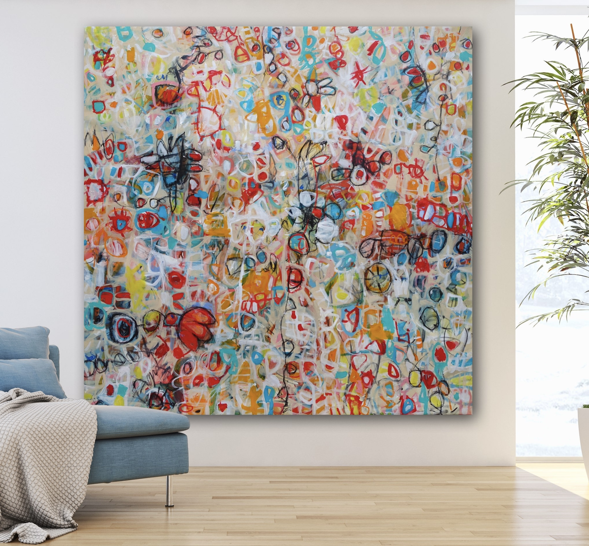This work is oil and acrylic, 150cm X 150cm on Fine Belgian Linen. The work is sealed with a Gloss Varnish and Signed on the front. Artist CV and Certificate of Authenticity included. The work is painted on the sides so that it can be hung without exterior framing if required.The work is Unstretched and sent in a roll ready for stretching.
