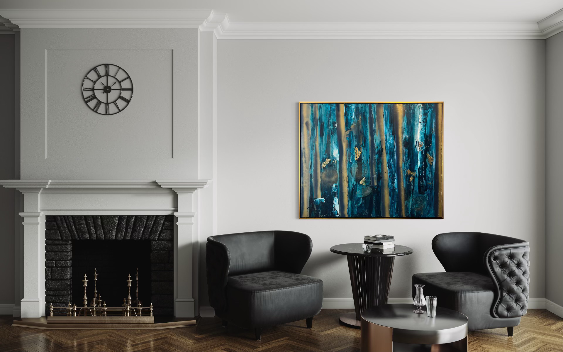 Night walks in amongst my marri trees throws me blue endless foliage and the feeling of peace. This painting is rich in blue hues, gold leaf and gold spray that reflects under light. It is framed in gold treated wood and would be a stunning feature on any large wall.