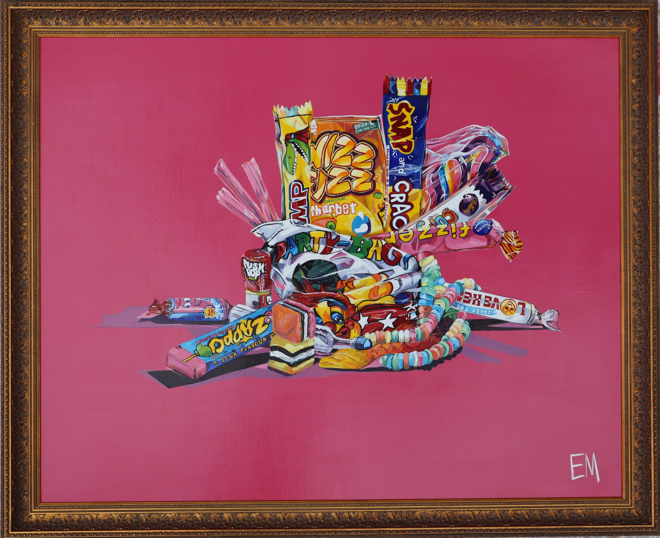 As always, Elisha has worked directly from her subject here, she paints what she sees. It was a pleasure for her children to eat the props after the painting was completed. The painting featuring classic treats of the 80’s Wizz Fizz, Curly Wurly and the Push Pop. This painting has a strong connection with her childhood, it has evoked feelings of nostalgia in all who have had the chance to view this piece in the flesh.