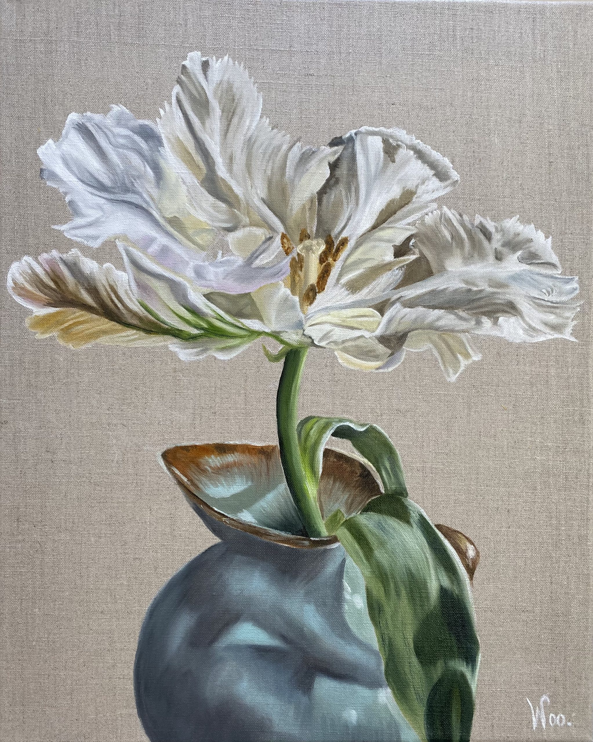 A Moment in Time by Wendy Peters – Ltd Ed Print by Wendy Peters – A Moment in Time. Who doesn’t love a flower in a jug and what better flower than a tulip fully opened before it wilts and drops its petals. Reminds me of country cottages with their nooks and crannies, creaky floorboards, wooden eaves and the smell of home cooking. A beautiful print that would really suit any room in the house. Original oil on canvas sold.