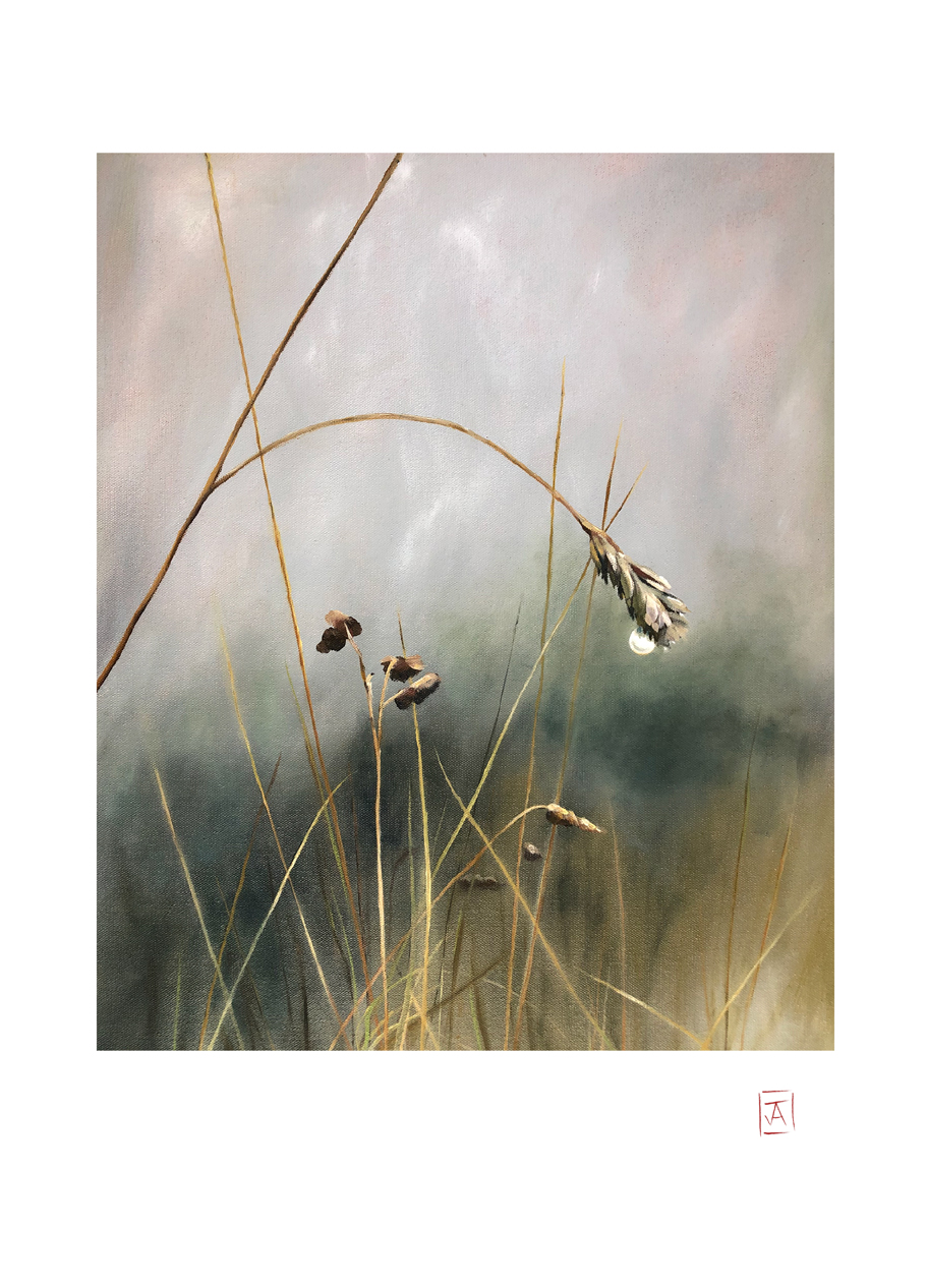 A Moment In Time: by Josslyn & Martin -Limited edition (100) print. In this print based on a painting from Josslyn. The inspiration for this work arrived entirely by surprise. While travelling through Victoria, we stopped at Apollo Bay and were told that the view from the hilltop was spectacular. When we reached the summit, however, the landscape had vanished—swallowed by a thick, motionless mist. With no vista to be seen, Josslyn turned inward, shifting focus from the grand to the intimate. Exploring the small details around us, she began capturing macro photographs of the moisture-laden foliage. Among them was a single droplet, poised on the edge of a leaf, suspended in the quiet before falling. That fragile moment—simple, fleeting, and completely unplanned—became the subject of this painting. It is a study of stillness, observation, and the beauty found when expectations dissolve.