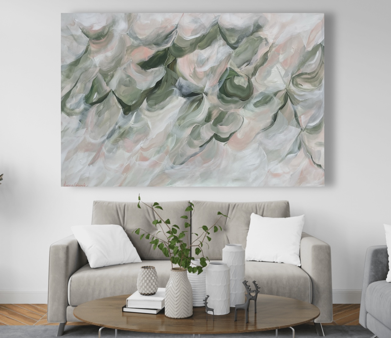 The green hues range from pale, almost pastel shades to deeper, richer tones. This gradient of greens adds depth and dimension to the composition. The use of soft green evokes feelings of nature, growth, and tranquility, connecting us to the natural world. A calming artwork that adds a sense of peace to any space.
