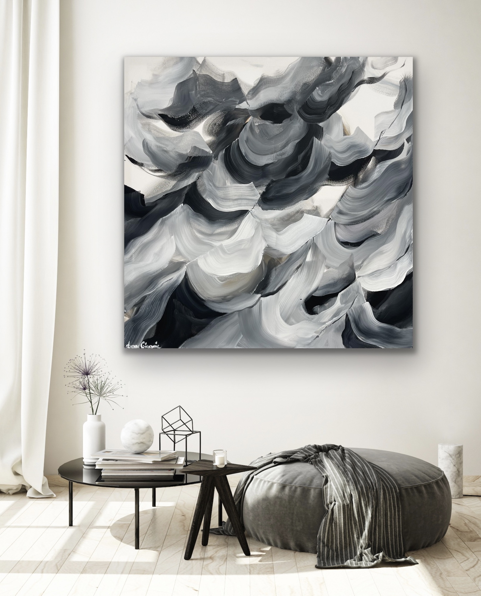 The contrast between black and white is used to create a sense of depth and dimensionality in this painting. The starkness of the two colours conveys a range of emotions, from the bold and dramatic to the serene and calm. A great feature painting in any space.