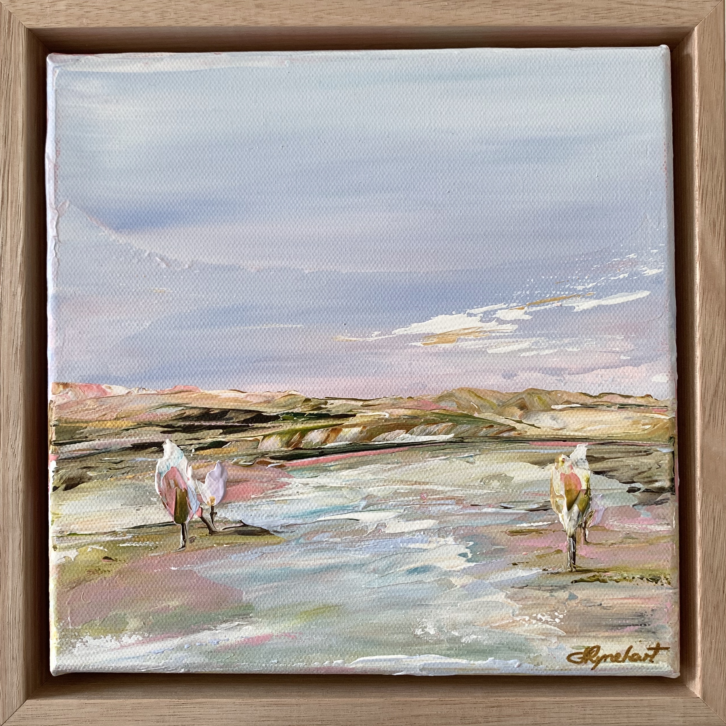 This is a sweet landscape in my Moments series. Created with a palette knife, with a hint of metallic gold in the pretty palette, this pretty landscape is framed in a beautiful natural timber oak frame, ready to hang, or sit as a decor piece on a table, shelf, buffet, etc. I hope it inspires you to find courage in the days and moments that challenge you.