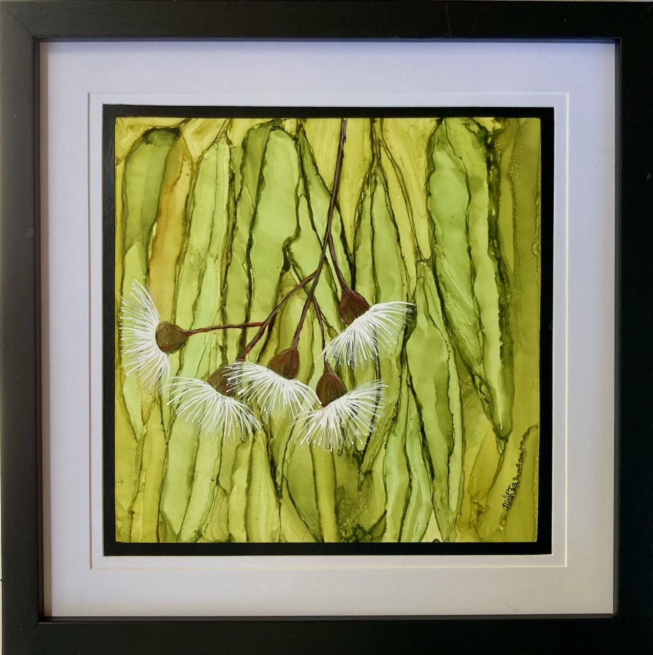 This small original mixed media painting on 20cm by 20cm Yupo Paper is depicting white gum flowers in front of fresh green leaves. In many cultures, leaves symbolize fertility, hope, growth, re-birth or a ‘New Beginning’. We often use the fraise ‘turning a new leaf’ when we are starting something new.