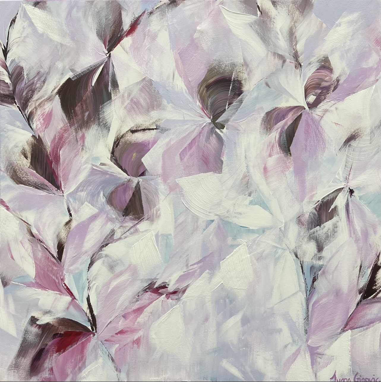 This painting was inspired by the start of a new season highlighting cooler tones of blue, purple and lilac. These tones create a piece that is fresh, bright and modern. A lovely addition to any room.
