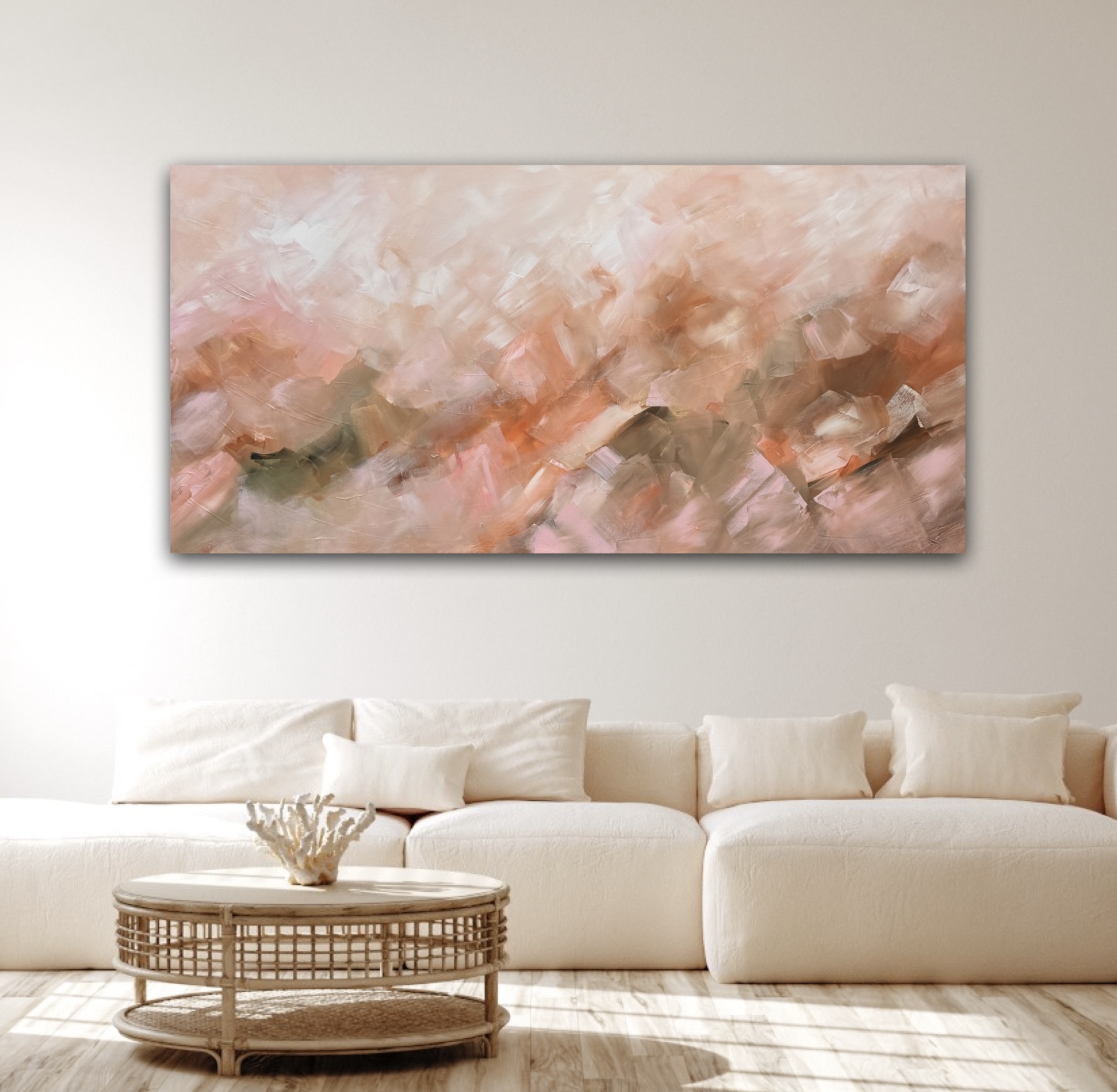 This abstract artwork is a harmonious blend of warm earthy tones, featuring soft pinks, gentle oranges and subtle greens. The textured brushstrokes create a sense of movement and depth creating a calming and dreamlike feel.