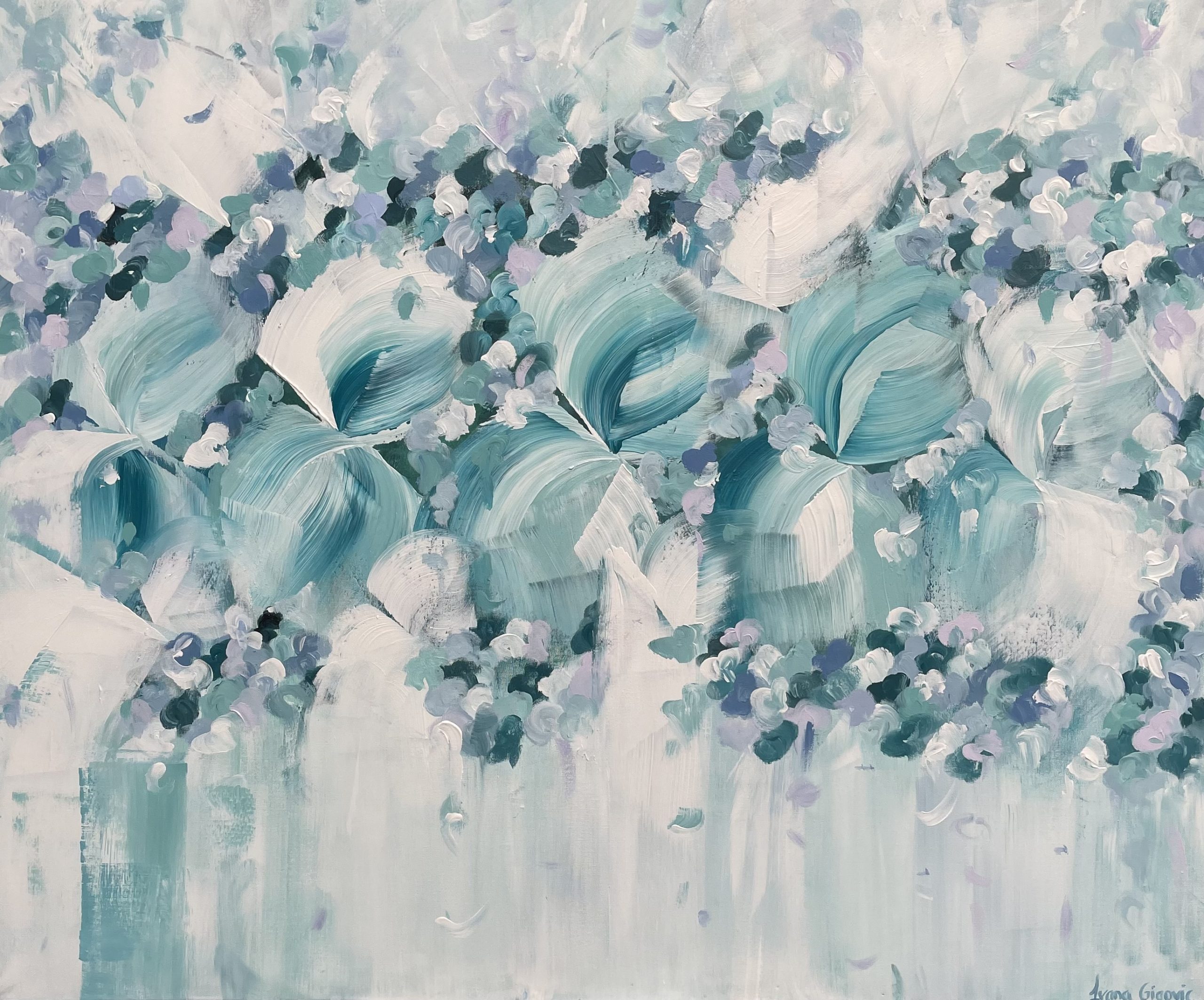 I loved creating this artwork! The lovely shades of teal and blue are vibrant yet soft. A touch of lilac adds something special. A great feature in any room. I hope you love it as much as I do!
