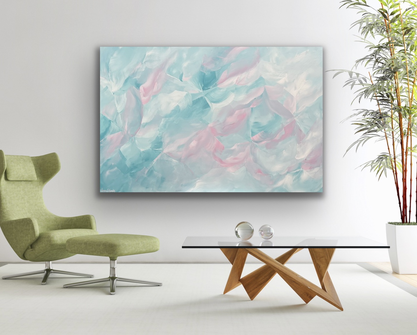 Soft shades of teals and pinks highlight the soft and calm nature of the latest addition to my ‘A New Day’ series. This series is all about creating a positive and happy feel through lovely shades of pastels. These tones compliment any space beautifully adding a sense of peace and happiness.