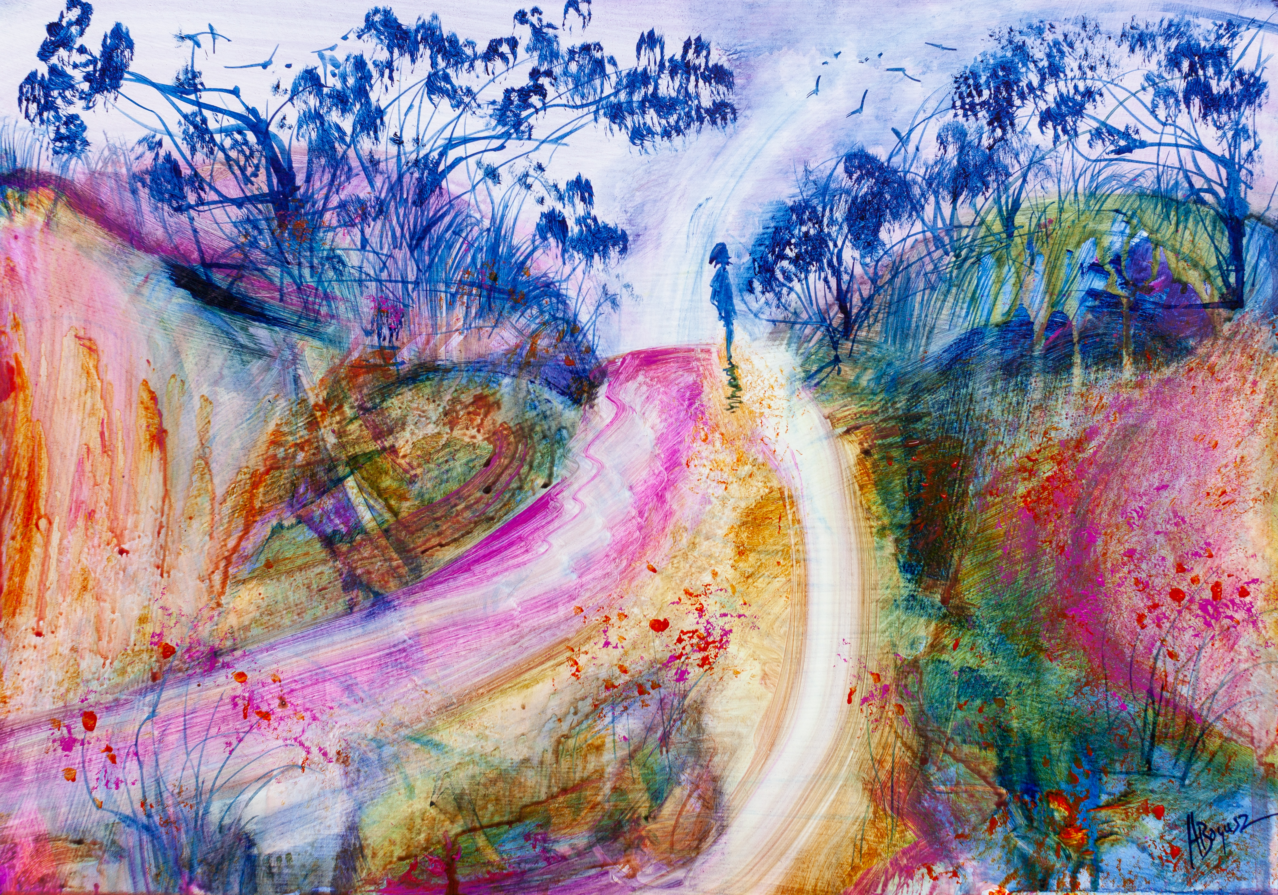 “A new path” is a painting about pushing ourselves into new areas and searching for the unknown. Life can get into a routine and lose it’s magic if we aren’t careful. This painting is about recapturing that magic.