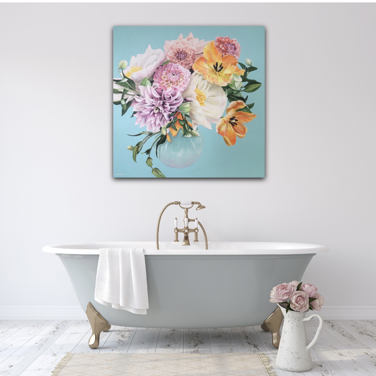 Each gorgeous bloom leaping up from a traditional duck egg blue backdrop emanating their showy colours and irresistible scents.