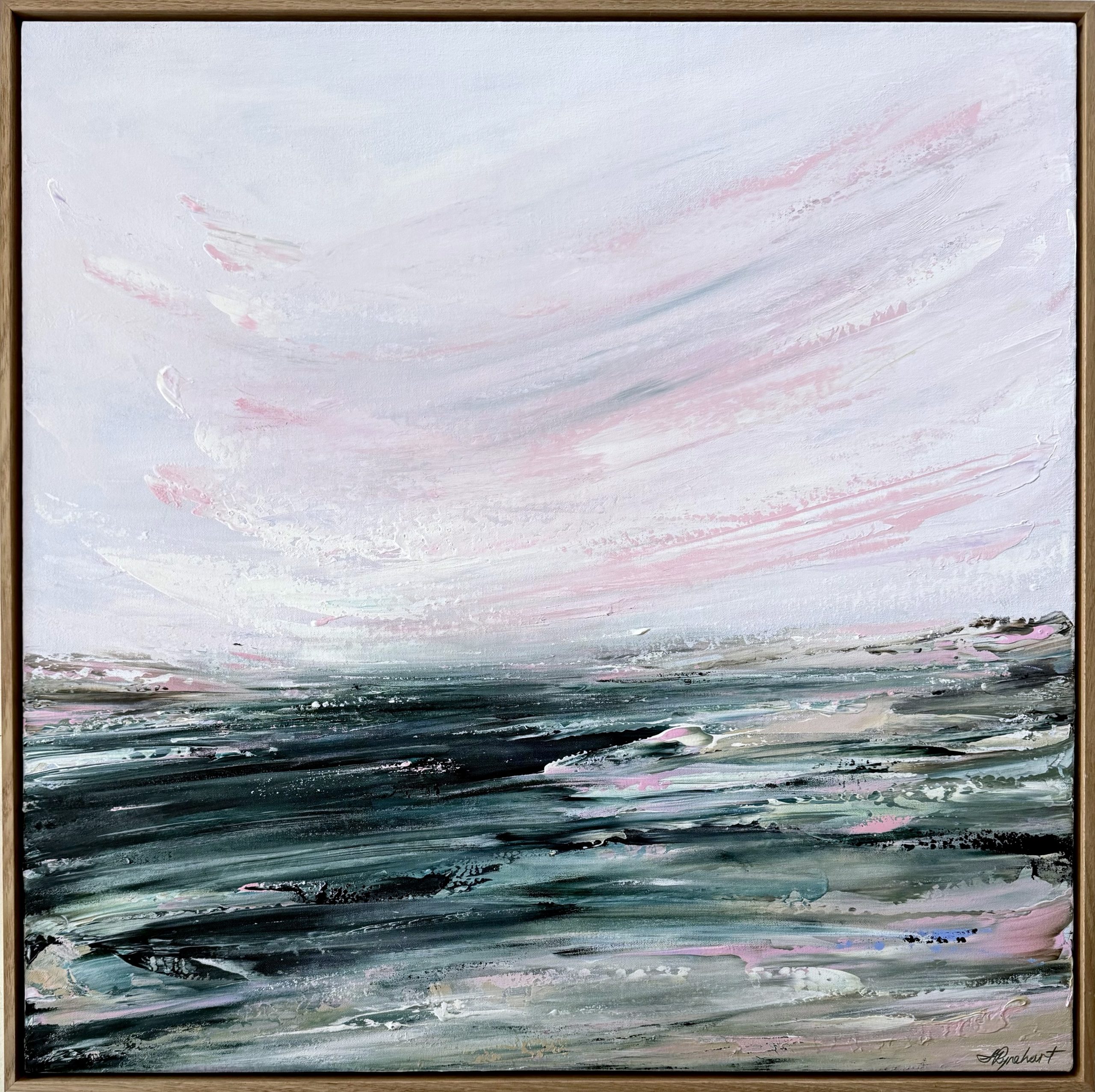 This emotive palette knife seascape capturing movement and light at dusk over the coastline, features deep sea greens and teal blues, contrasted with soft lilacs and pinks, sand and white.