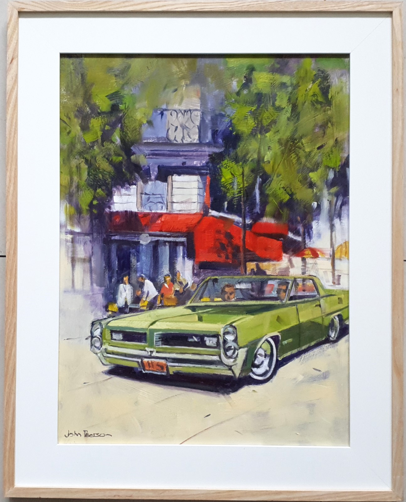 A Piece Of Heaven by John Pearson captures one of those peaceful moments when all worries are cast aside as a couple drive slowly past an old building in their 1960s car.