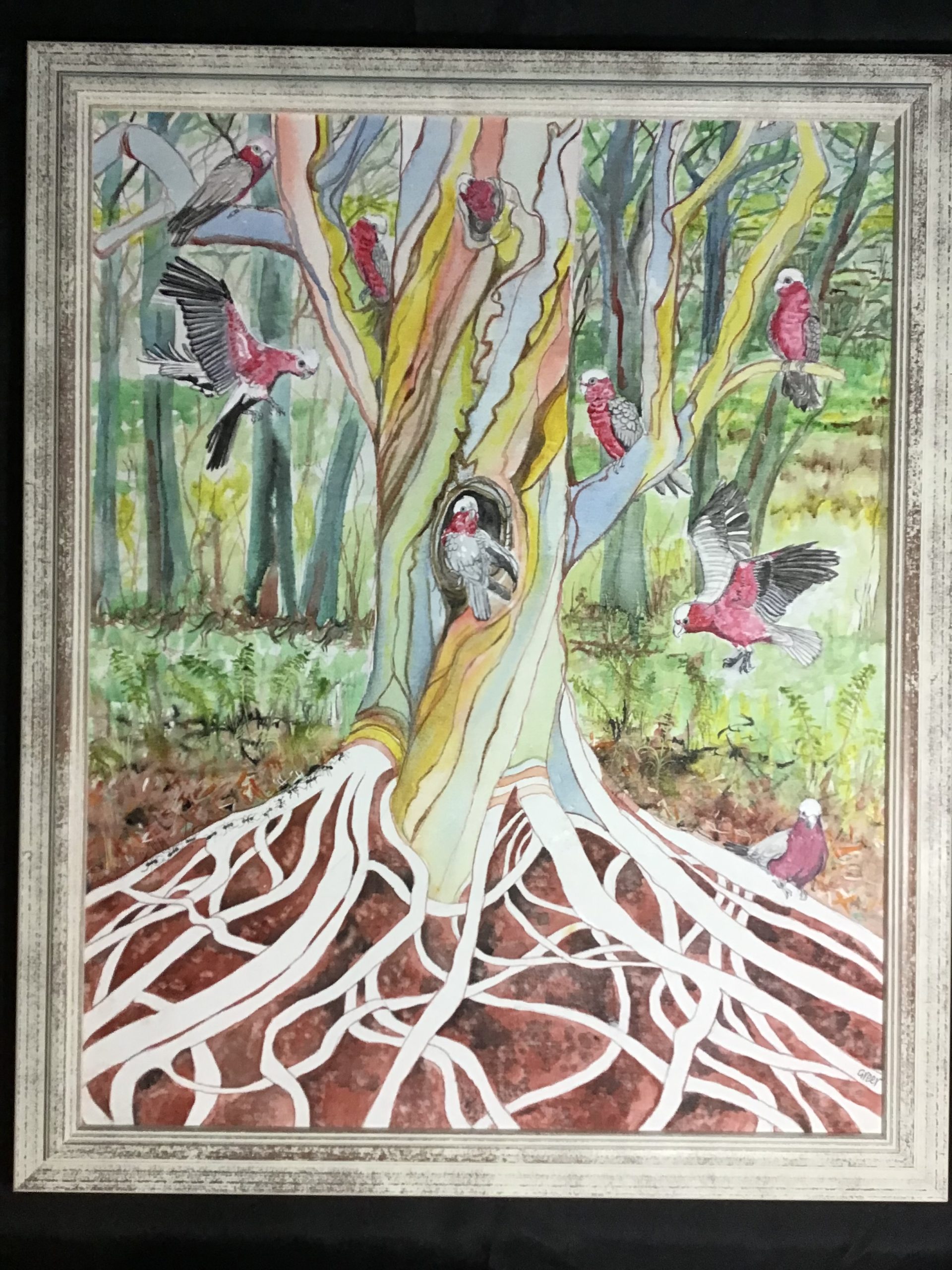 A Place to call home by Greer Pollard  – Original painting in acrylics of a tree in my local park. Featuring Australian animals and Pink and Grey Galahs that are secreted amongst the branches and roots of the beautiful old tree. Painted on board and framed with a neutral coloured frame that compliments the colours in the painting.