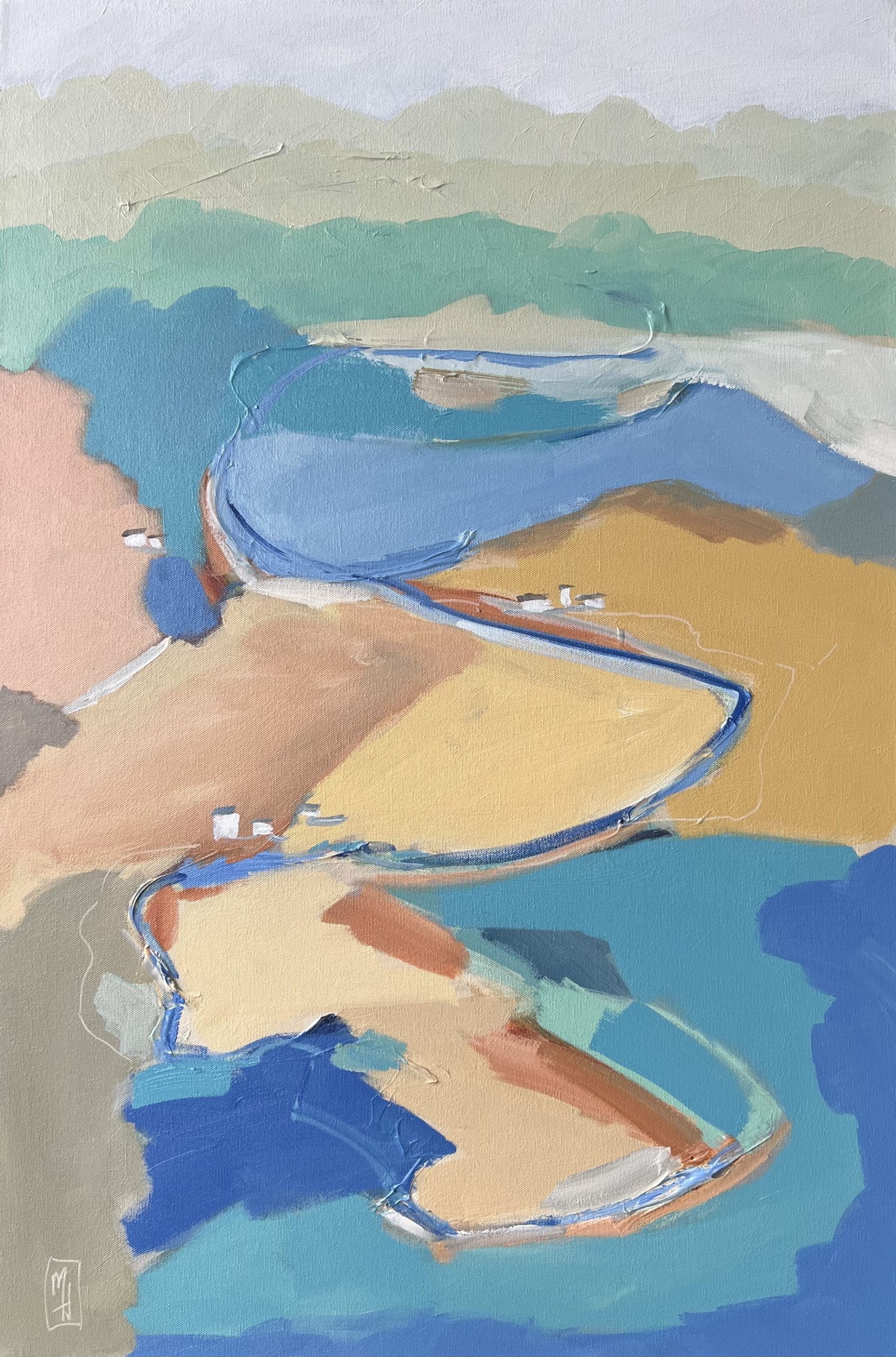 Textural artwork with greens, beige and cool blues. Abstract landscape art with the colours of nature.